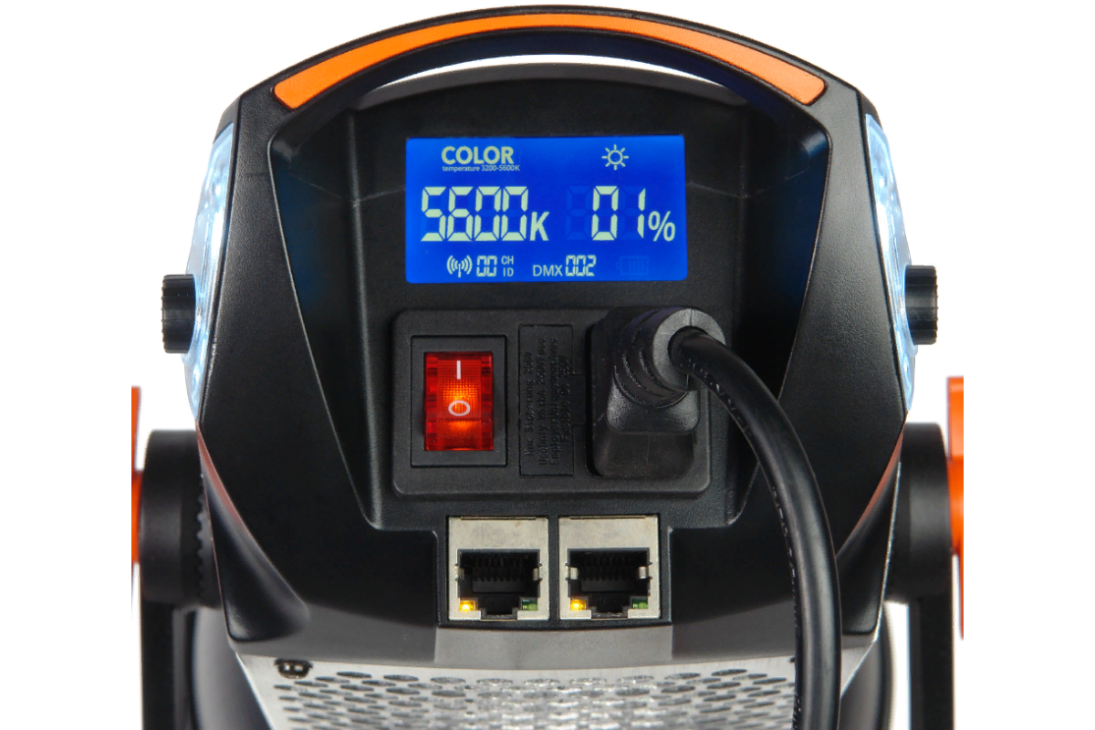 Два диммера с подсветкой, расположенные слева и справа на корпусе осветителя, предназначены для ручного управления и настройки. Правый диммер отвечает за установку мощности осветителя, а нажатие диммера в качестве кнопки помогает выбрать канал DMX. Левый диммер – за настройку и выбор номера ID радиоканала.