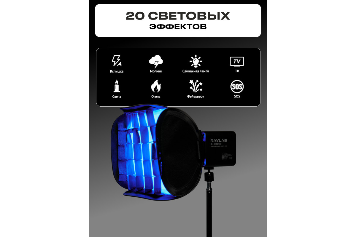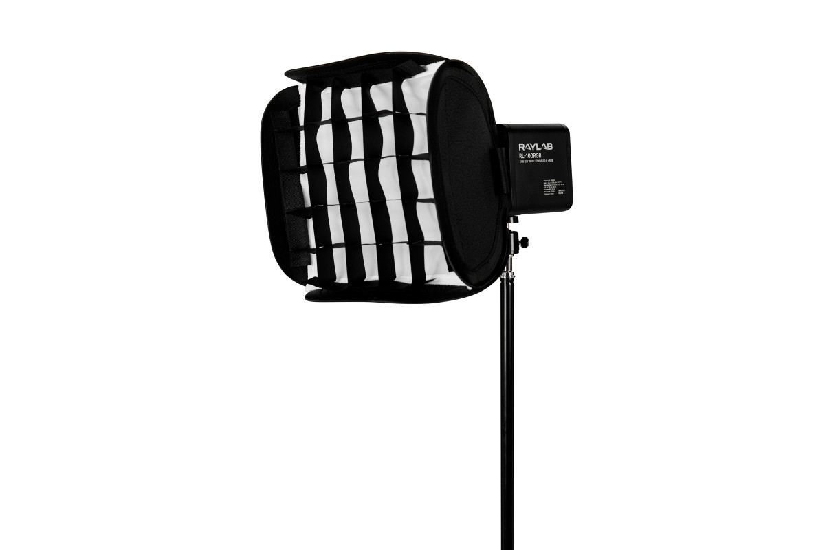 В комплекте имеется квадратный софтбокс к сотовой насадкой для создания мягкого света.