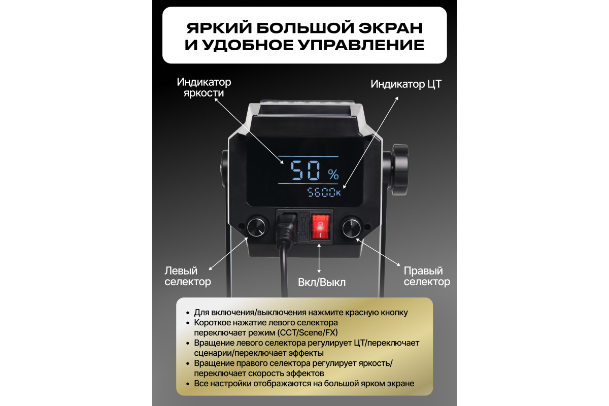 Прибор имеет большой яркий ЖК дисплей, широкий диапазон регулировки цветовой температуры, встроенные специальные эффекты и пульт дистанционного управления в комплекте.
