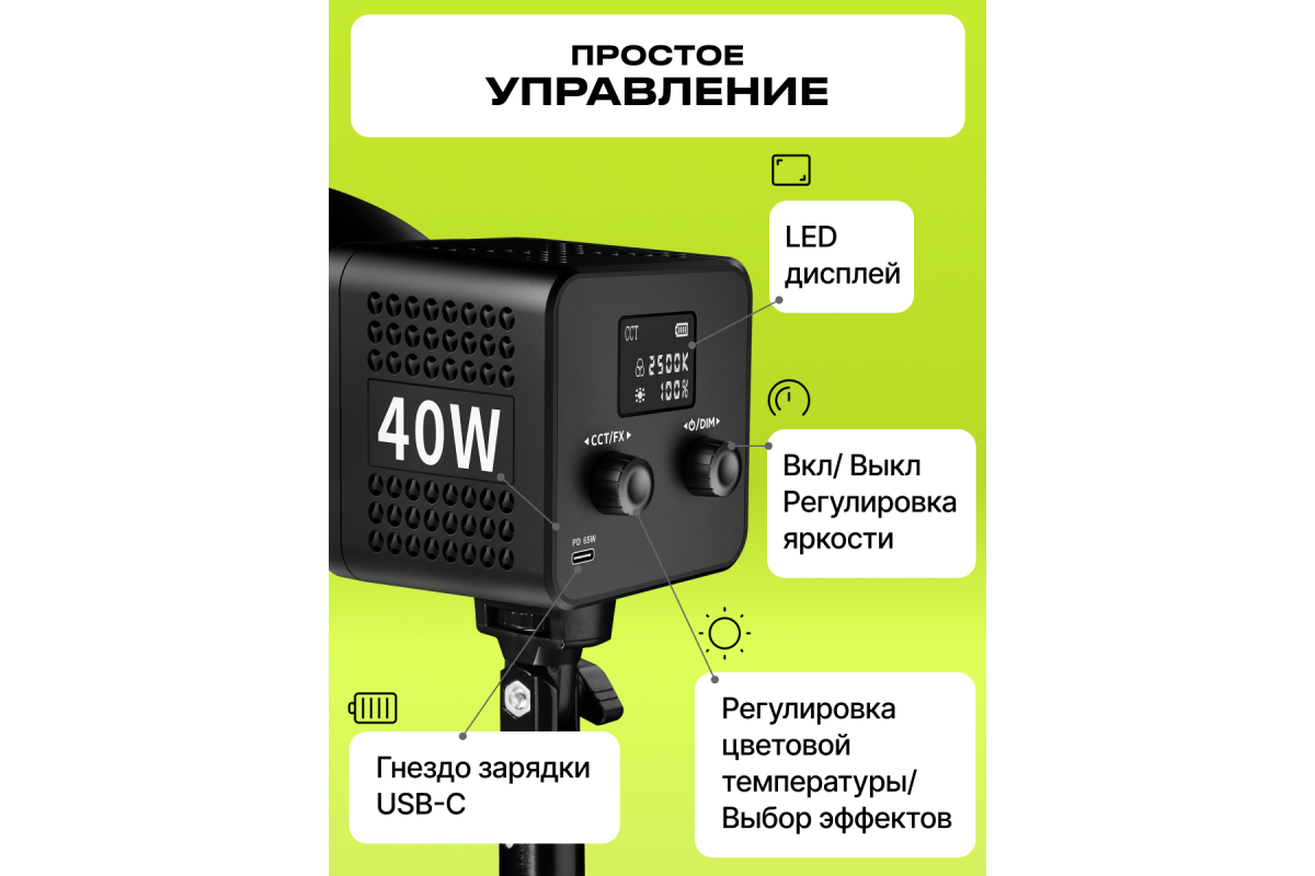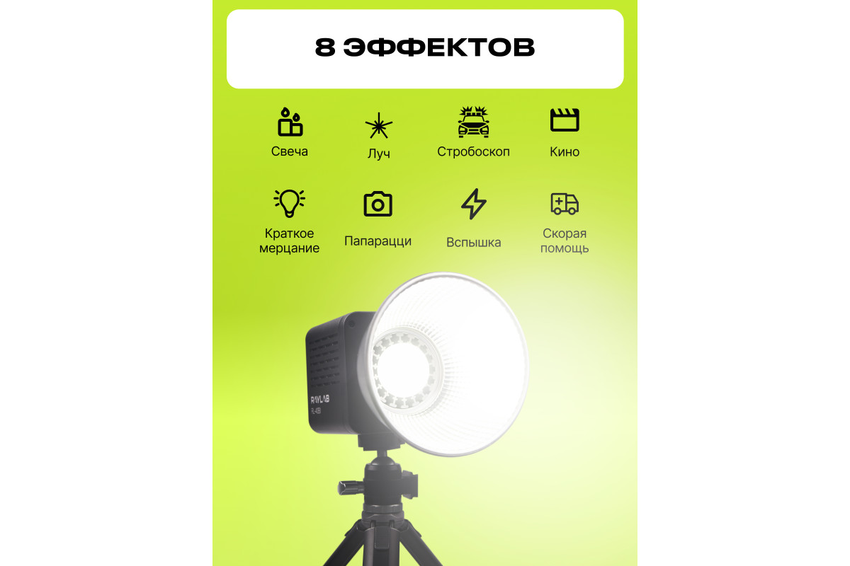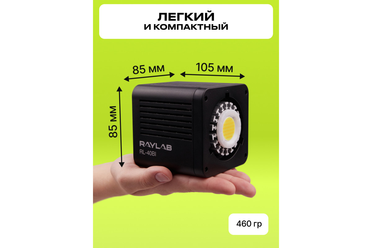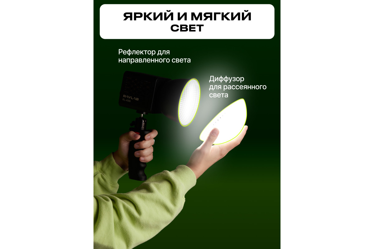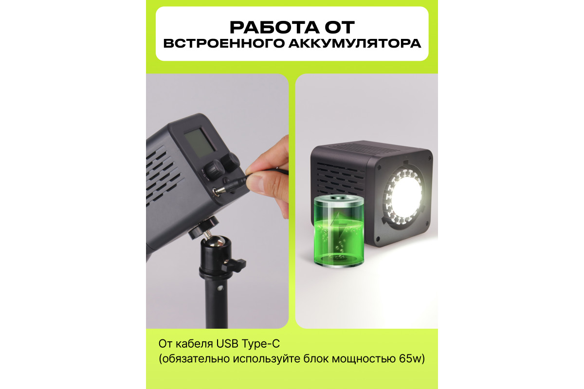 Этот светодиодный мини-моноблок – лучший выбор для создания красивых и качественных видео дома, в студии и на выездной съёмке. Его небольшой размер позволяет его использовать в качестве дополнительно для контрового света. Он имеет встроенный LCD дисплей и возможность регулировки цветовой температуры в диапазоне 2500-6500K, что дает большую гибкость при работе в различных условиях освещения. А также предусмотрено 8 световых эффектов. Светодиоды обладают высоким CRI ≥ 95 и сроком службы до 50 000 часов. Моноблок может работать как от сети, так и от встроенного аккумулятора - 75 минут на максимальной мощности. Для создания более направленного или мягкого света в комплект входят рефлектор и диффузор.