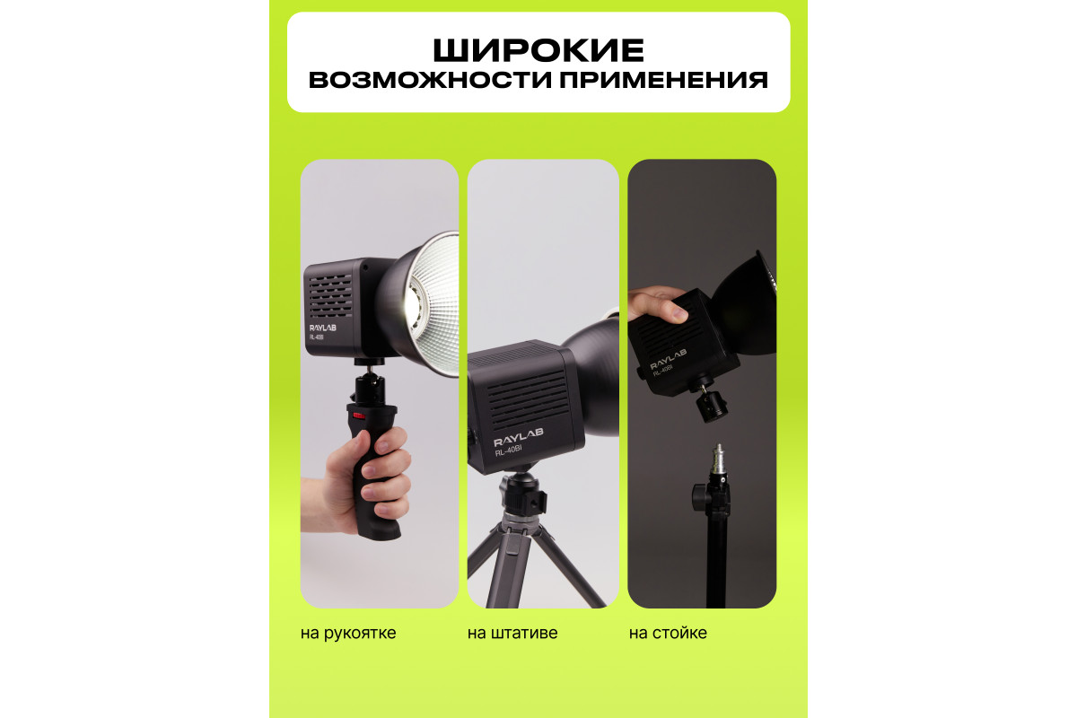 Комплектация: осветитель, рефлектор, диффузор, адаптер питания, шаровая голова, рукоятка, инструкция