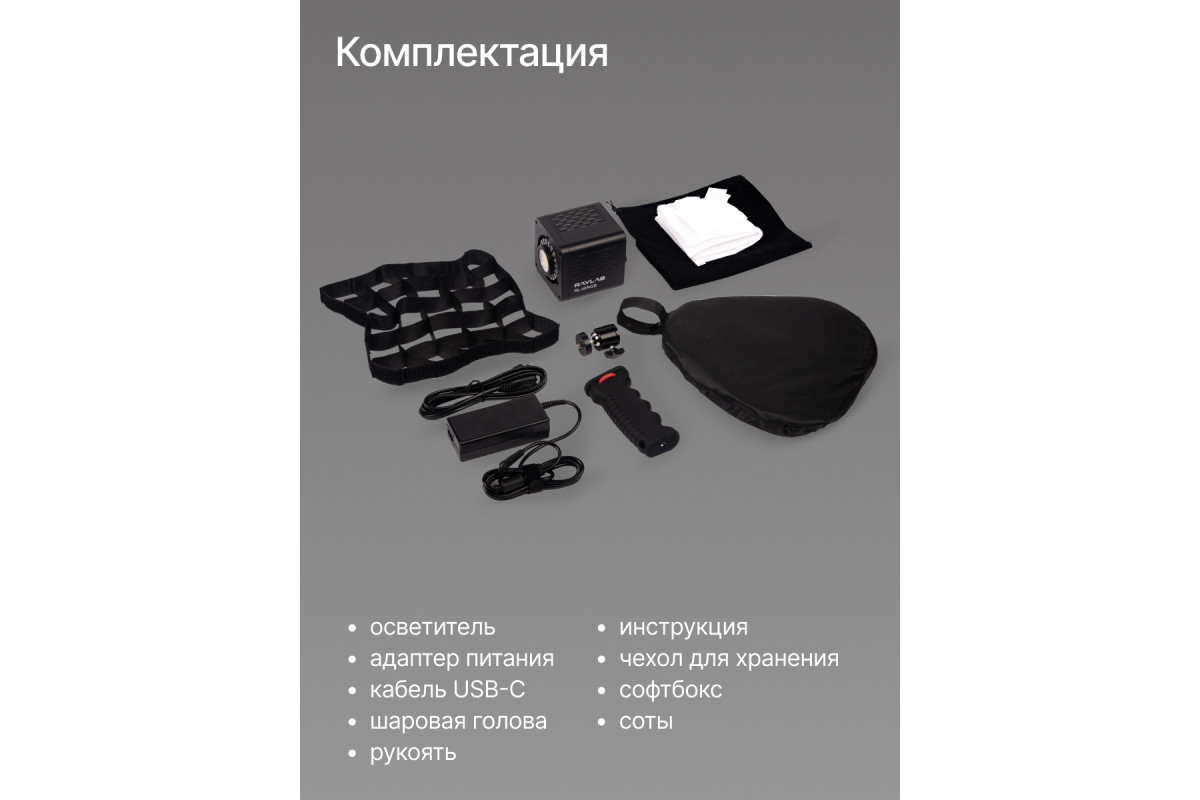 Этот светодиодный мини-моноблок – обновлённая версия популярной модели RL-40, теперь в RGB исполнении. Ваш лучший выбор для создания красивых и качественных видео дома, в студии и на выездной съёмке. Небольшой размер позволяет использовать его в качестве дополнительно для контрового света, а широкий диапазон цветов и оттенков в палитре RGB 360, позволит создать неповторимую атмосферу в кадре. Осветитель имеет встроенный LCD дисплей и возможность регулировки цветовой температуры в диапазоне 2500-6500K, что дает большую гибкость при работе в различных условиях освещения. А также предусмотрено 20 световых эффектов. Светодиоды обладают высоким CRI ≥ 95 и сроком службы до 50 000 часов. Моноблок может работать как от сети, так и от встроенного аккумулятора - до 70 минут на максимальной мощности. Для создания более жесткого направленного или, наоборот, мягкого света в комплект входят рефлектор и диффузор.