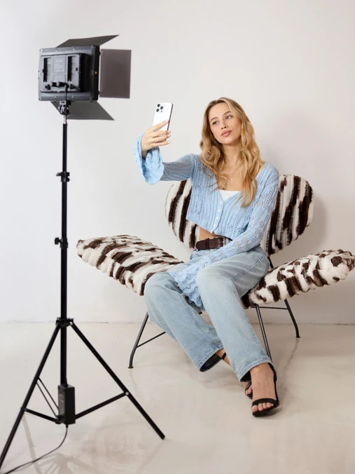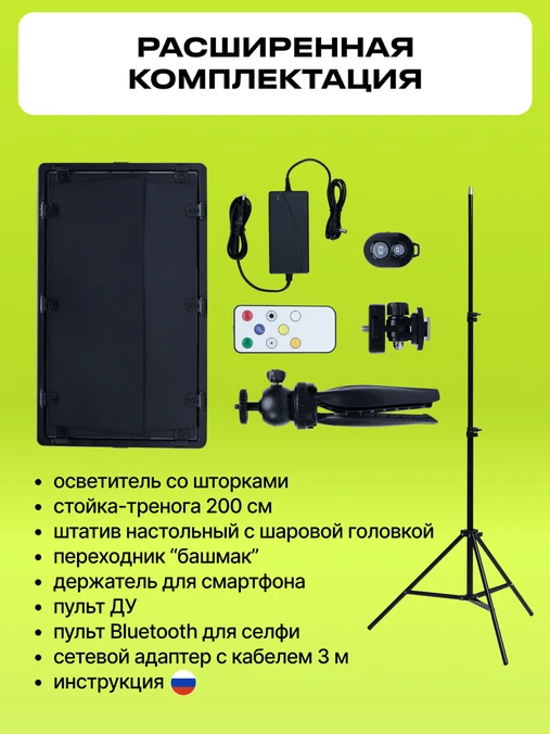 В комплект также входит стойка-тренога высотой до 200см, настольный мини-штатив, и держатель для телефона с возможностью установки на стойку-треногу одновременно с осветителем. Кроме того, имеется Bluetooth селфи-кнопка.