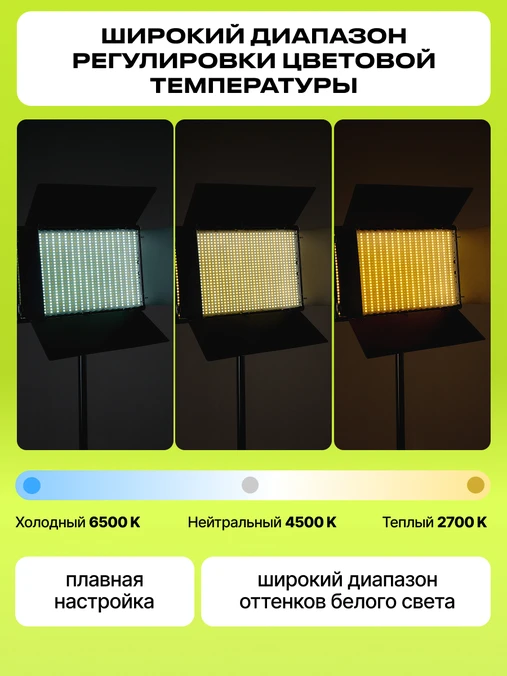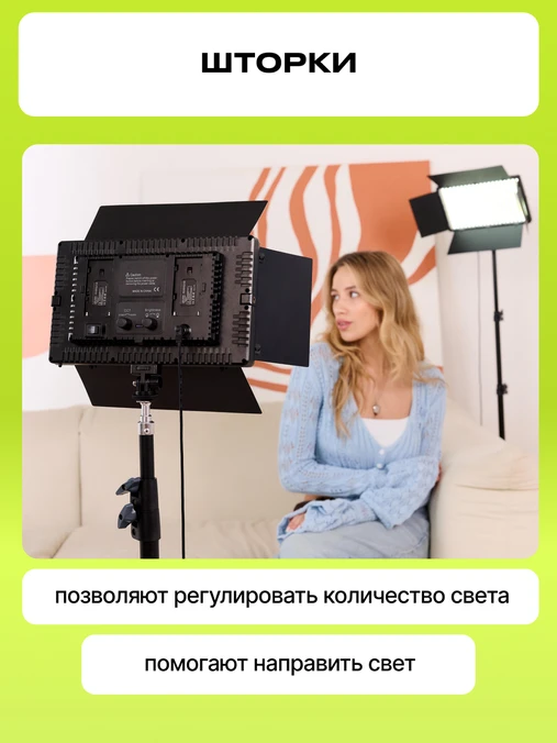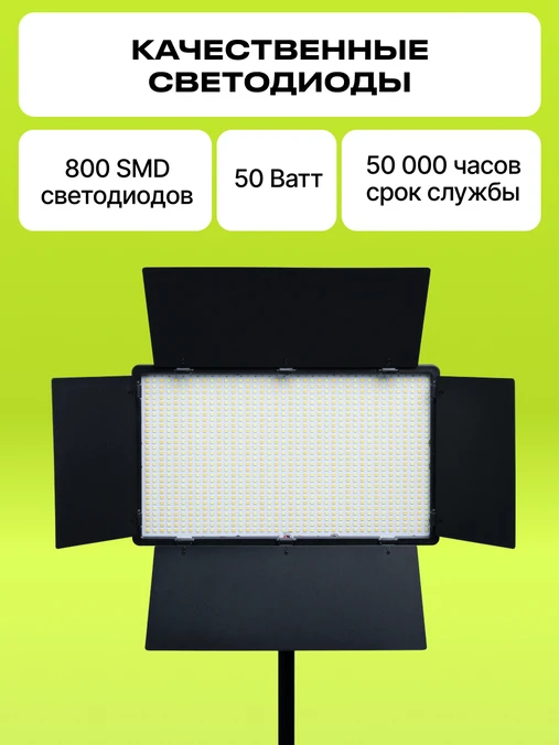 Основой комплекта является мощная светодиодная панель 50 Ватт, оснащённая 800 светодиодами. Доступна регулировка цветовой температуры в пределах 2700-6500К и плавная регулировка мощности. Встроенные шторки позволяют настраивать необходимый угол рассеивания светового потока.