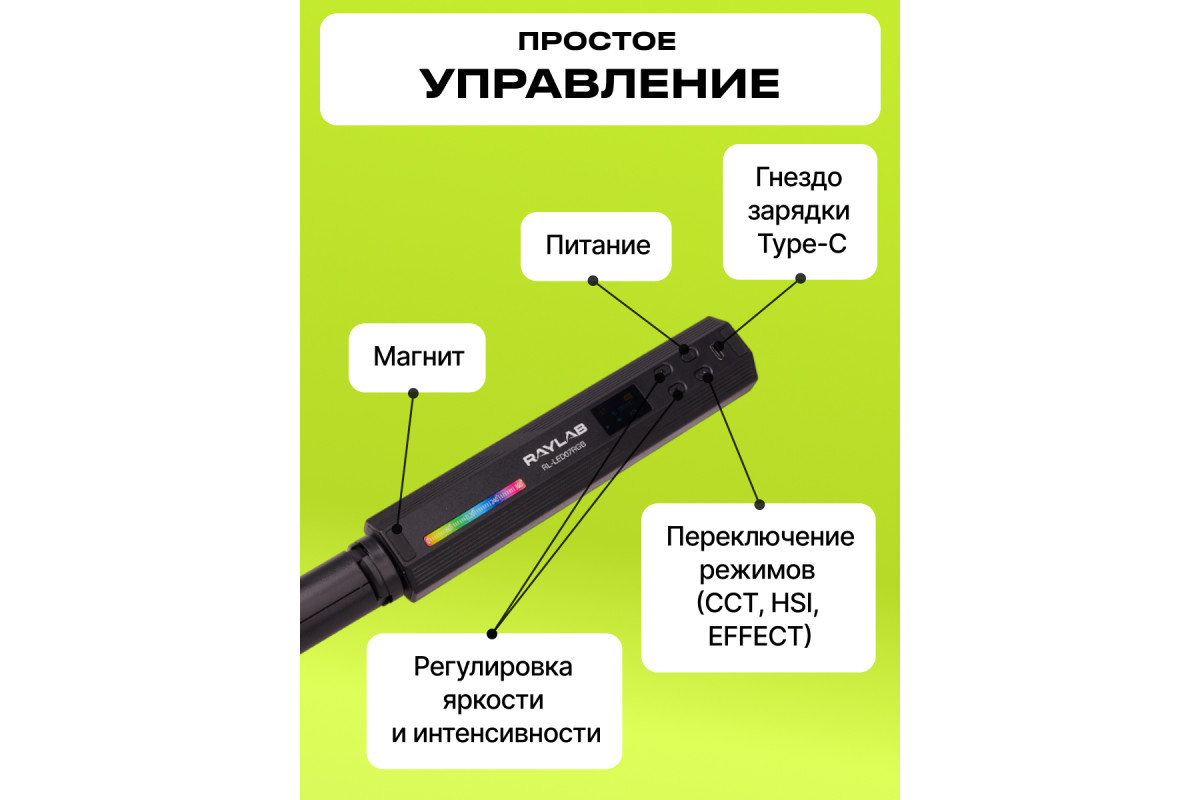 Raylab RL-LED07R - удивительным осветителем, который превратит ваши снимки и видео в настоящие произведения искусства. С его помощью вы сможете создавать захватывающие линейные блики, создавать остронаправленные тени и добавлять яркие цветовые акценты. Уникальный форм-фактор в виде трубки позволяет вам разместить его где угодно, будь то внутри автомобиля, бытовой техники или даже под одеждой. Независимо от места, вы сможете наслаждаться широким световым потоком и создавать потрясающие эффекты. С цветной лампой Raylab RL-LED07R вы можете выбирать между дневным светом с диапазоном цветовой температуры от 2500К до 9000К для создания естественного освещения, RGB режимом или 20 различными световыми эффектами для ярких цветных кадров. Благодаря высокому индексу цветопередачи CRI>95, вы сможете передать цвета и оттенки объектов максимально точно и без искажений. Встроенный аккумулятор емкостью 3000мАч обеспечивает неоновой лампе до 10 часов непрерывной работы, что позволяет вам сосредоточиться на съемке, не беспокоясь о заряде. Установка осветителя на штатив или стойку становится легкой благодаря резьбовым креплениям 1⁄4" на основании. А с встроенным магнитом, вы можете использовать светодиодный осветитель как самостоятельный прибор, закрепив его на стальной поверхности, такой как труба или решетка. Неоновая лампа Raylab RL-LED07R обладает мощностью 7 Вт и осветит ваш объект с интенсивностью 800 люксов на расстоянии 0.3м. 184 светодиода (69 белых, 69 желтых и 46 RGB) обеспечивают яркий и равномерный свет. С плавной регулировкой мощности от 1% до 100%, вы сможете точно настроить освещение в соответствии с вашими потребностями. Селфи лампа RL-LED07R компактная и легкая, с размерами 200х41х37 мм и весом всего 157 гр. Поэтому будет надёжным помощников, который всегда с вами. Не упустите возможность приобрести Raylab RL-LED07R и открыть для себя новые грани творчества. Он поможет вам достичь невероятных результатов в качестве ваших снимков и видео, и станет незаменимым аксессуаром для каждого творческого проекта.
