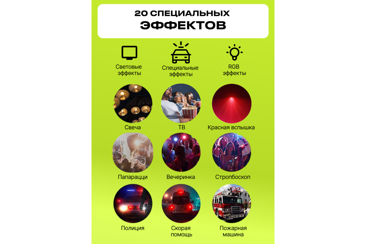 Количество светодиодов: 184 (69 белых, 69 желтых и 46 RGB)