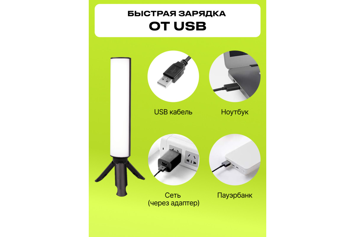 Комплектация: осветитель, мини-штатив, кабель USB, инструкция