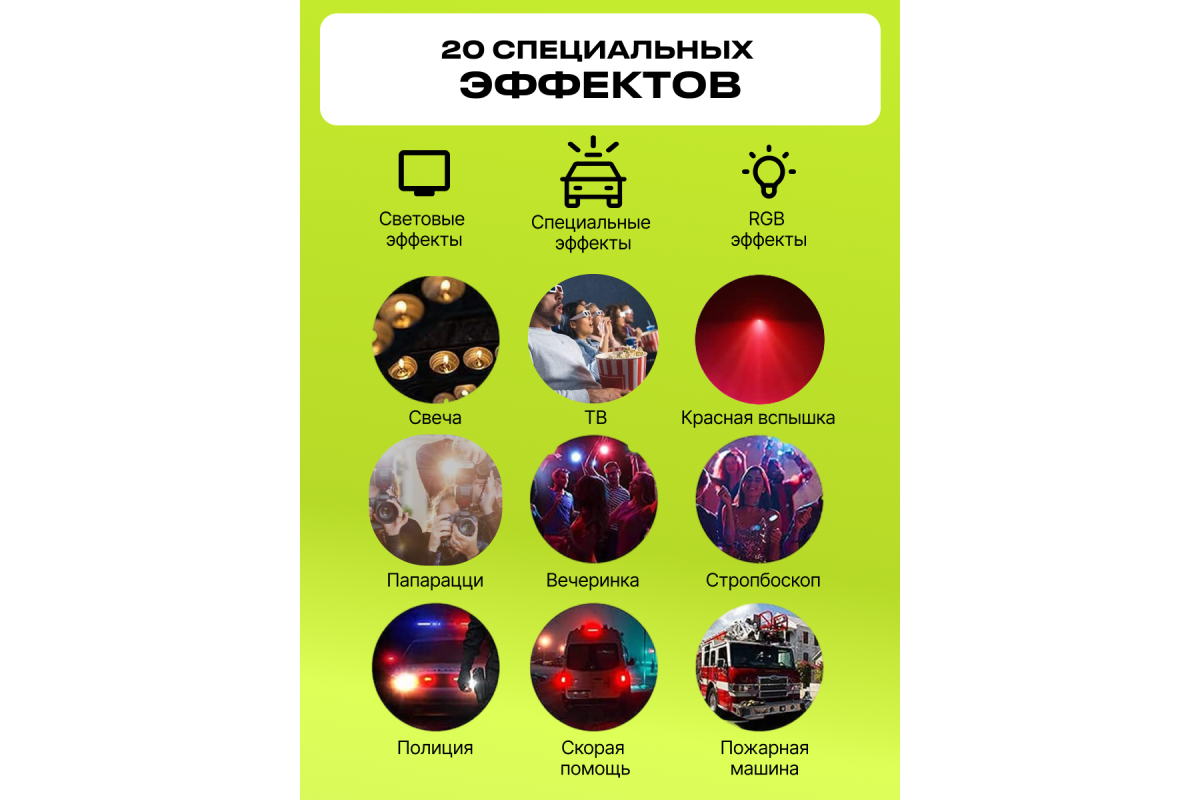 Количество светодиодов: 140 (49 белых, 49 желтых и 42 RGB)