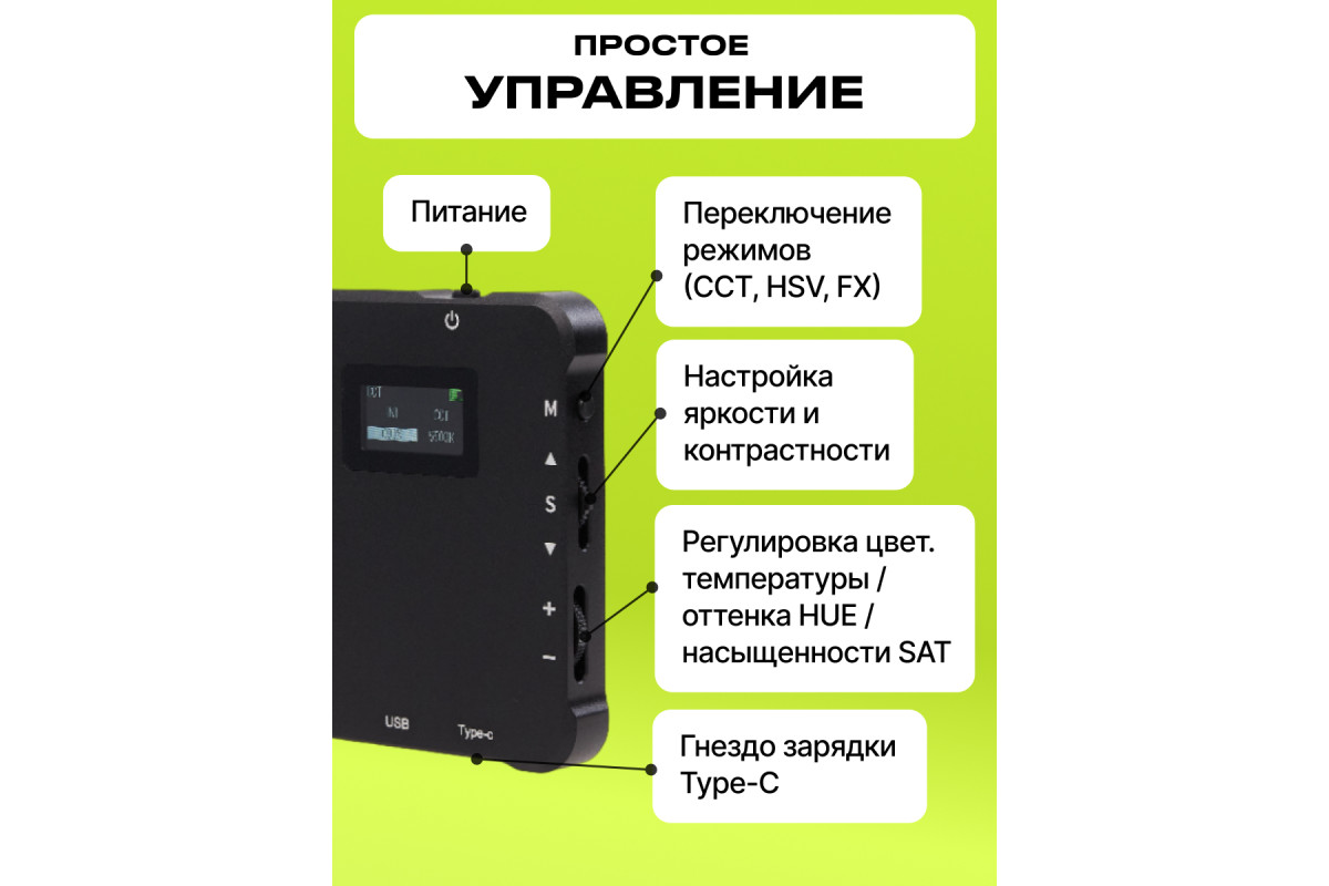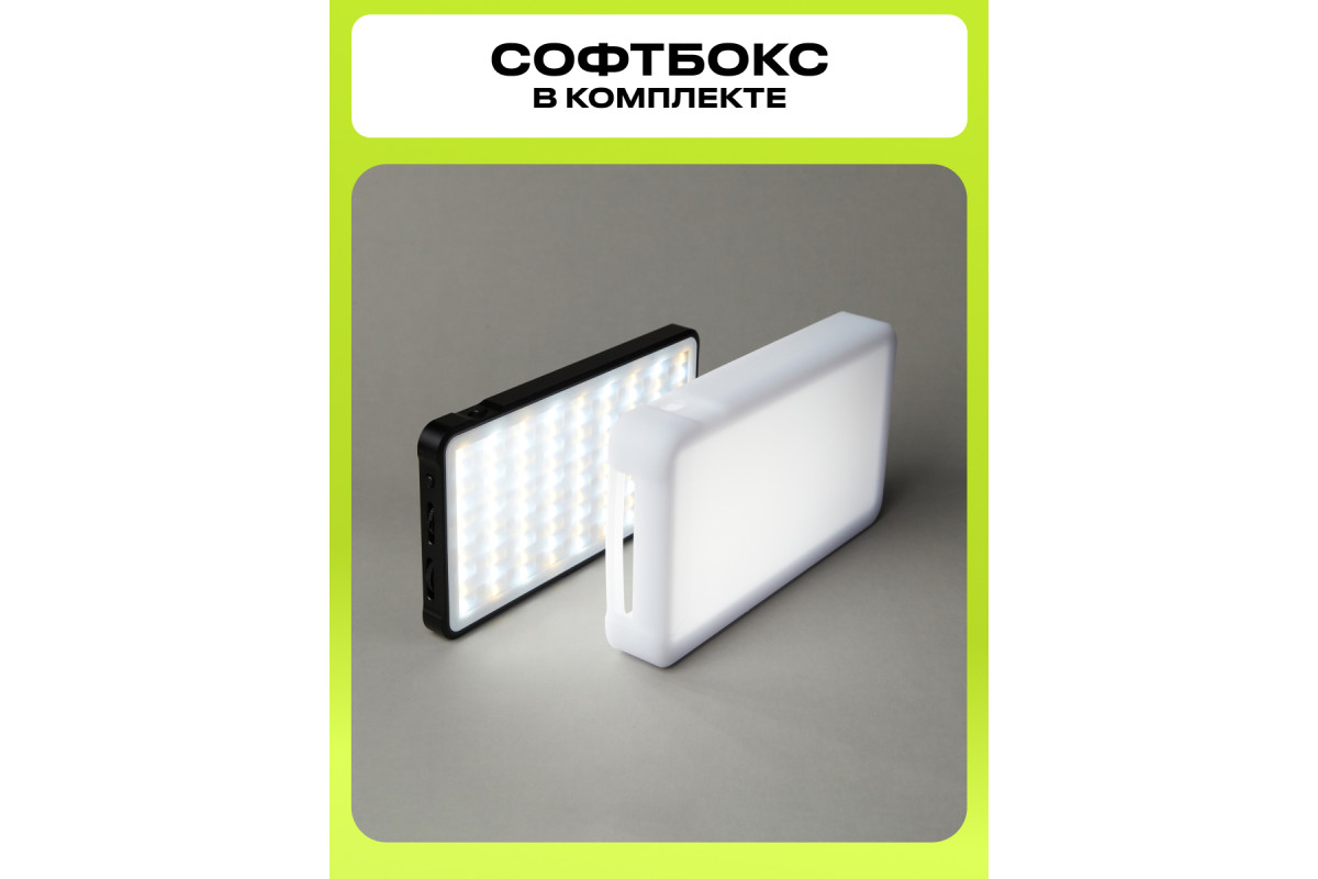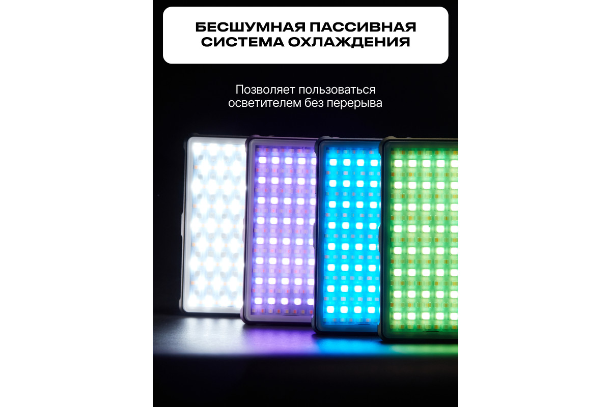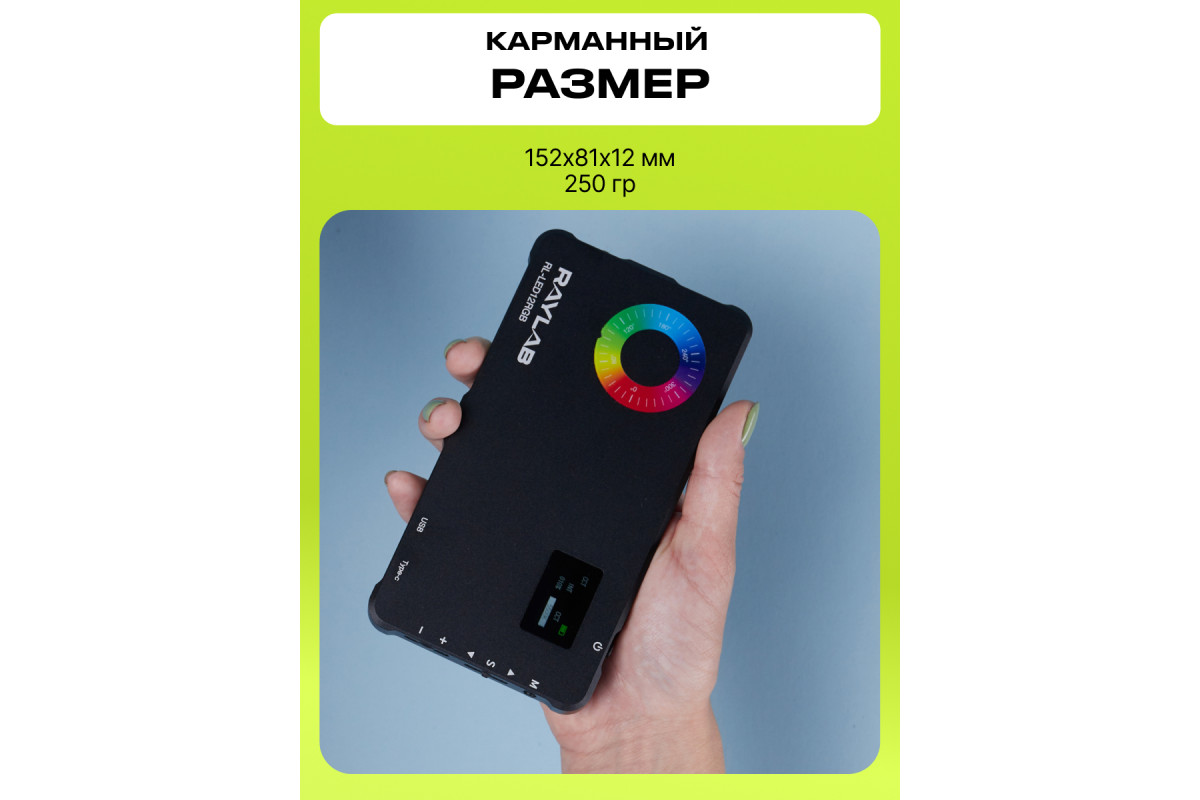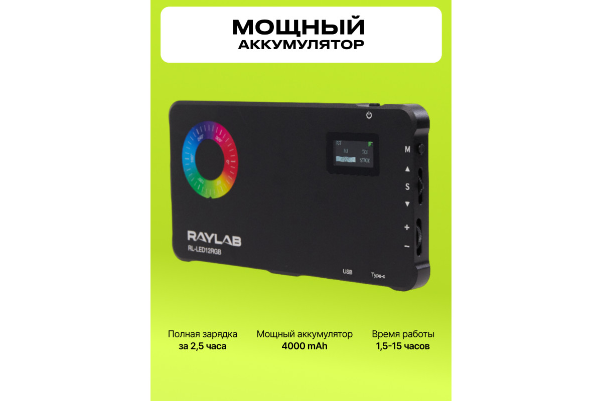 RL-LED12RGB – компактный RGB-осветитель, видеосвет RGB цветной, для видеографов, фотографов и визажистов с power bank в корпусе! Это вариает кольцевой лампы, удобный мобильный свет, лампа светодиодная, светодиодный осветитель, студийный свет для видеосъемки, который подойдет в качестве дополнительного освещения в домашней студии для выездной съемки, селфи-блогов на ходу, онлайн трансляций, предметной и мобильной фотографии, цветной видеосвет и освещение для фото. Она легко подсветит ваш объект фото и видео съемки, подчеркнет его достоинства и придаст особый шарм каждому кадру. Вам больше не нужно беспокоиться о недостатке света в закрытых помещениях или при съемке в темное время суток. Широкий диапазон цветовой температуры CCT 2500-9000K, HSV режим и 24 световых эффекта позволяют передать уникальную атмосферу кадра. Если вы фотограф, бровист, визажист или косметолог, наш светоотражатель станет незаменимым помощником в вашей работе. Для создания более мягкого освещения в комплект входит силиконовый диффузор. Особые преимущества данной модели – возможность задавать значения HSI (RGB) по отдельным параметрам, использовать его при подключенной зарядке через Type-C, а также в качестве пауэрбанка для зарядки смартфона. Встроенный Li-Ion аккумулятор 4000mAh обеспечивает работу на максимальной мощности до 1,5 часов и на минимальной - до 15 часов. Данная модель доступна в 4-х цветах- чёрный, фиолетовый/ зелёный хаки/ синий. Это отличное оборудование для фото и видео или проведения фэшн фотосессии.