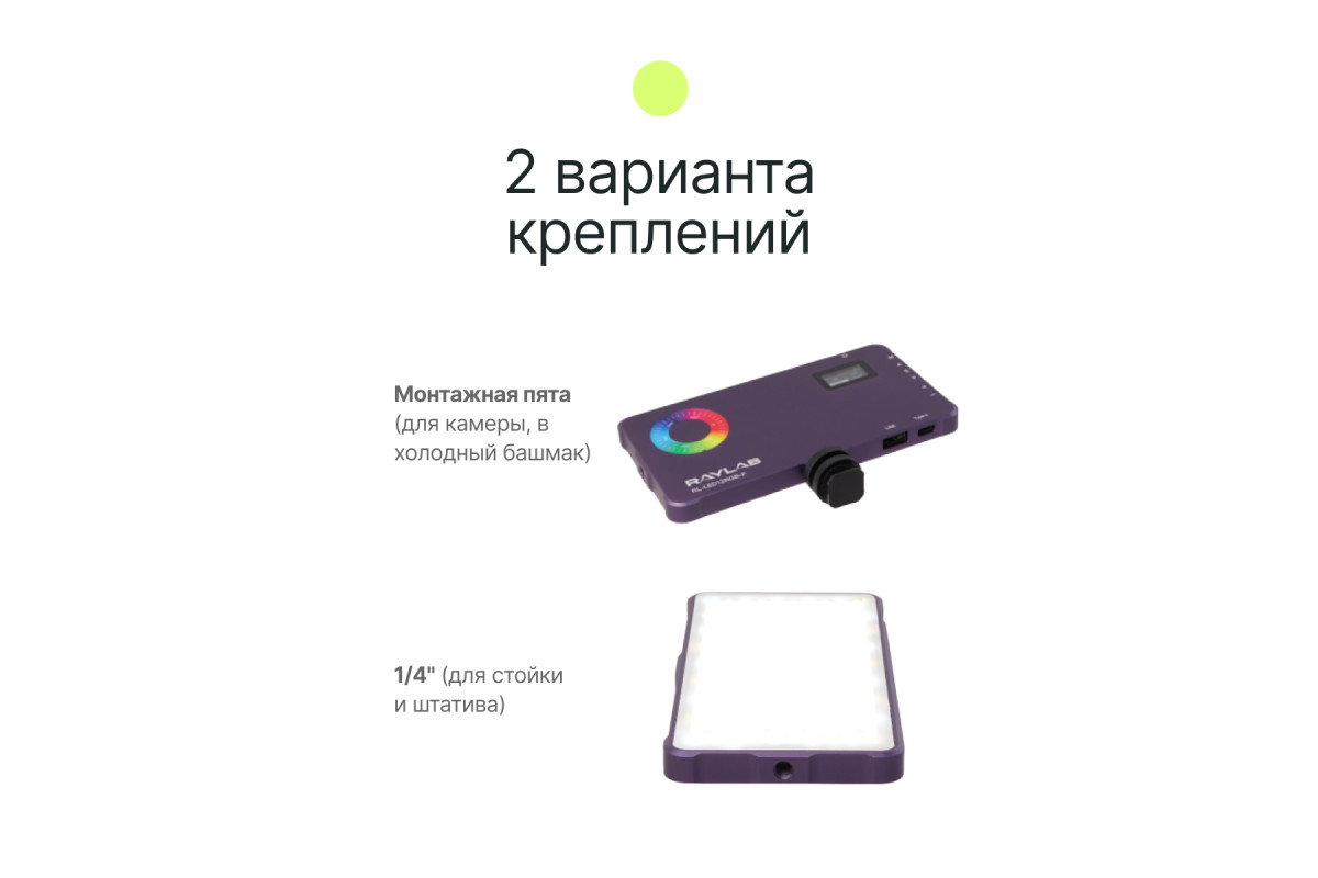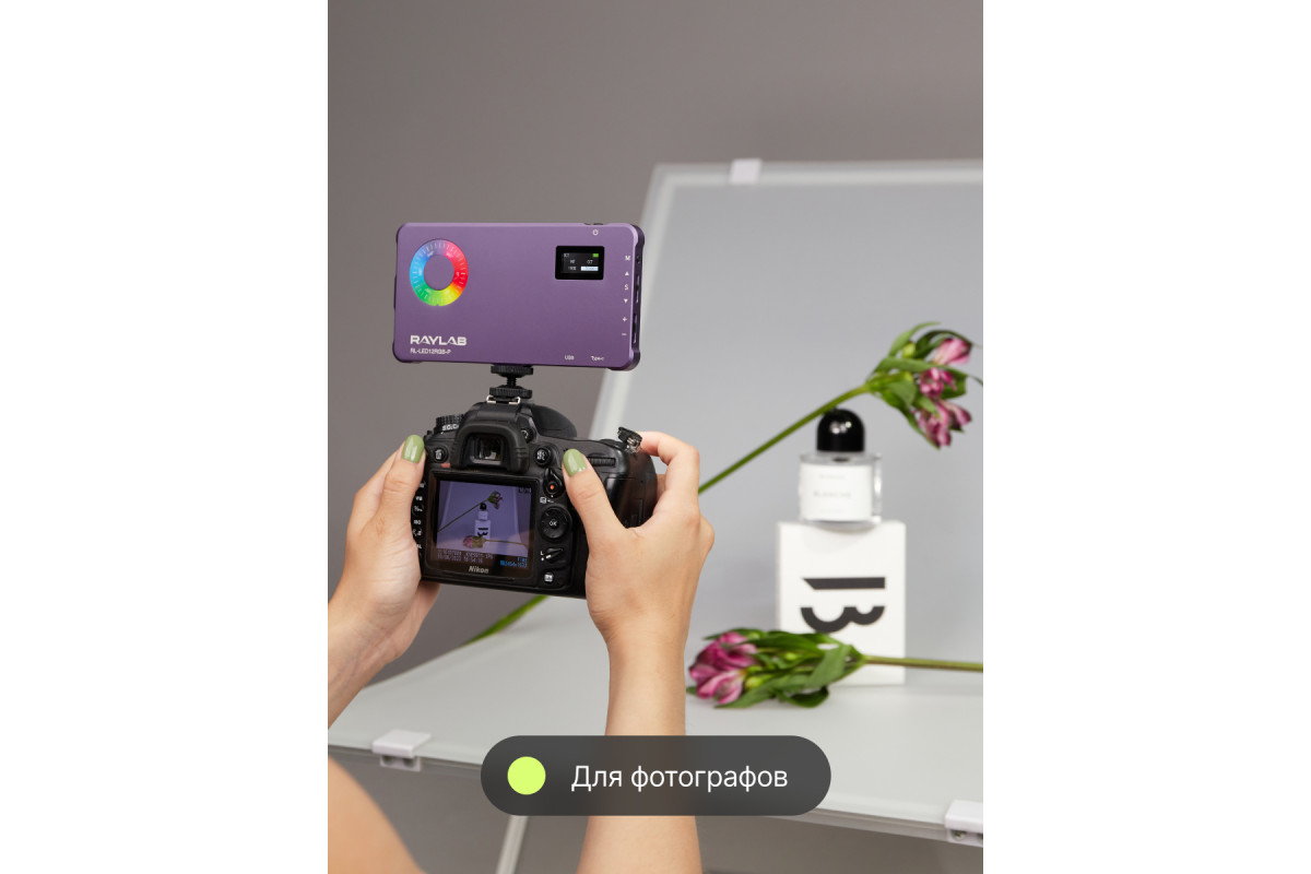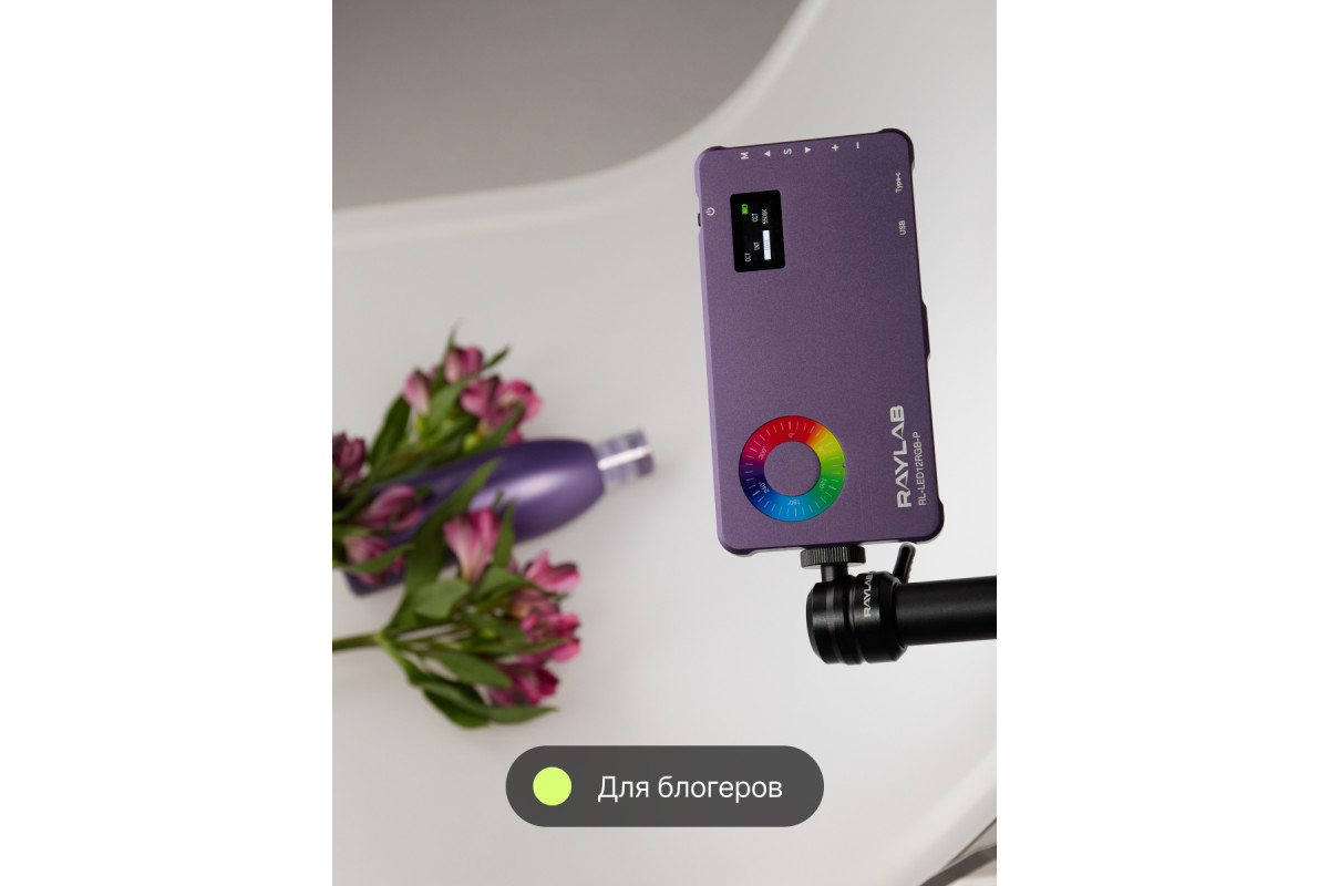 RL-LED12RGB – компактный RGB-осветитель, видеосвет RGB цветной, для видеографов, фотографов и визажистов с power bank в корпусе! Это вариает кольцевой лампы, удобный мобильный свет, лампа светодиодная, светодиодный осветитель, студийный свет для видеосъемки, который подойдет в качестве дополнительного освещения в домашней студии для выездной съемки, селфи-блогов на ходу, онлайн трансляций, предметной и мобильной фотографии, цветной видеосвет и освещение для фото. Она легко подсветит ваш объект фото и видео съемки, подчеркнет его достоинства и придаст особый шарм каждому кадру. Вам больше не нужно беспокоиться о недостатке света в закрытых помещениях или при съемке в темное время суток. Широкий диапазон цветовой температуры CCT 2500-9000K, HSV режим и 24 световых эффекта позволяют передать уникальную атмосферу кадра. Если вы фотограф, бровист, визажист или косметолог, наш светоотражатель станет незаменимым помощником в вашей работе. Для создания более мягкого освещения в комплект входит силиконовый диффузор. Особые преимущества данной модели – возможность задавать значения HSI (RGB) по отдельным параметрам, использовать его при подключенной зарядке через Type-C, а также в качестве пауэрбанка для зарядки смартфона. Встроенный Li-Ion аккумулятор 4000mAh обеспечивает работу на максимальной мощности до 1,5 часов и на минимальной - до 15 часов. Данная модель доступна в 4-х цветах- чёрный, фиолетовый/ зелёный хаки/ синий. Это отличное оборудование для фото и видео или проведения фэшн фотосессии.