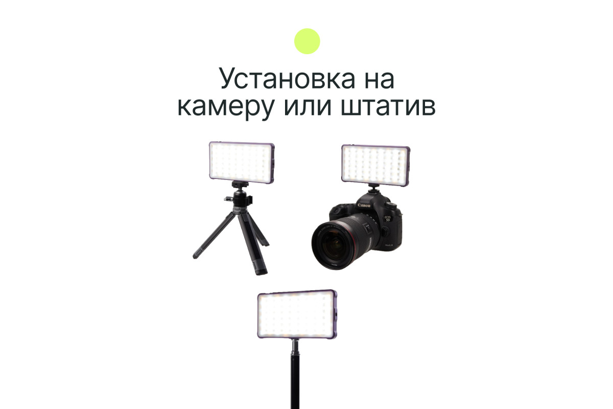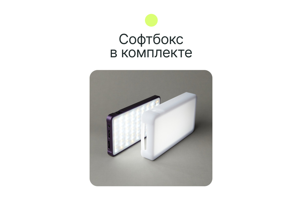 Осветитель, рассеиватель, холодный башмак, кабель USB Type-C, чехол.