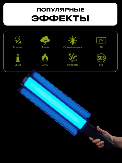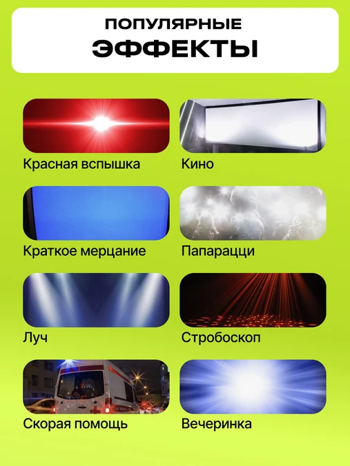Имеется 20 предустановленных спецэффектов, таких как спецсигналы полиции, скорой, пожарной машины, фейерверк, мерцание телеэкрана, неисправная лампочка, дискотека, огонь свечи и так далее.