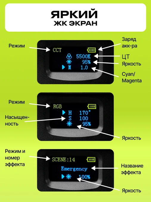 Прибор оснащён 360 высококачественными светодиодами (120 “теплый” свет, 120 “холодный” и 120 RGB), суммарной мощностью до 38Вт. Цветовая температура регулируется в широком диапазоне от 2500К до 10000К, а в RGB режиме доступна палитра HSI 360°.