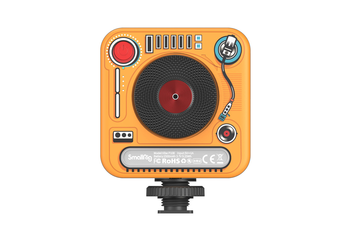 SmallRig Vibe P108 (“Phonograph” Limited Edition) —легкий, портативный светодиодный осветитель. Его светоизлучающая панель состоит из 28 светодиодов RGB, 40 светодиодов теплого и 40 светодиодов холодного цвета, что позволяет получить самые разные варианты освещения. С помощью большого эргономичного колеса управления легко настроить яркость (0% до 100%), цветовой тон (0-360°), цветовую температуру (от 2700K до 6500K) и выбрать один из двенадцати специальных световых эффектов.