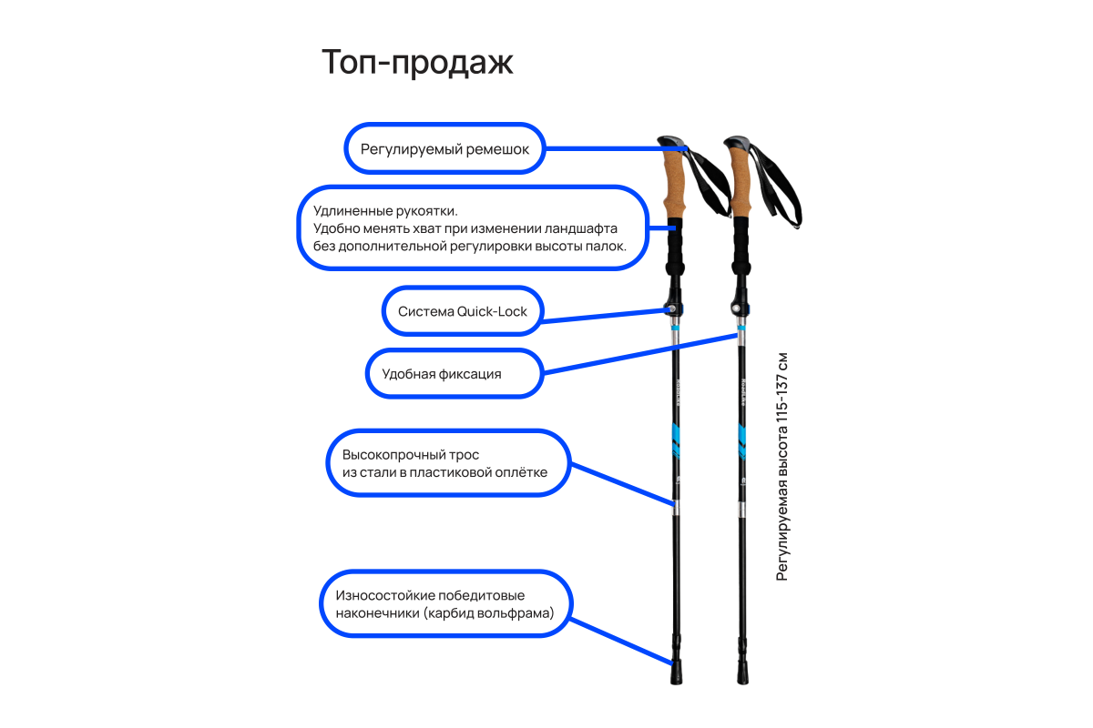 Палки для скандинавской ходьбы RoadLike - легкие и удобные телескопические палки с полным комплектом необходимых аксессуаров и системой flip-lock для регулировки высоты палок от 35 до 137 см.