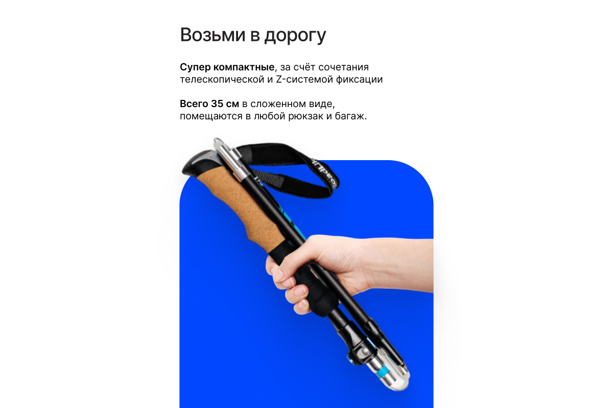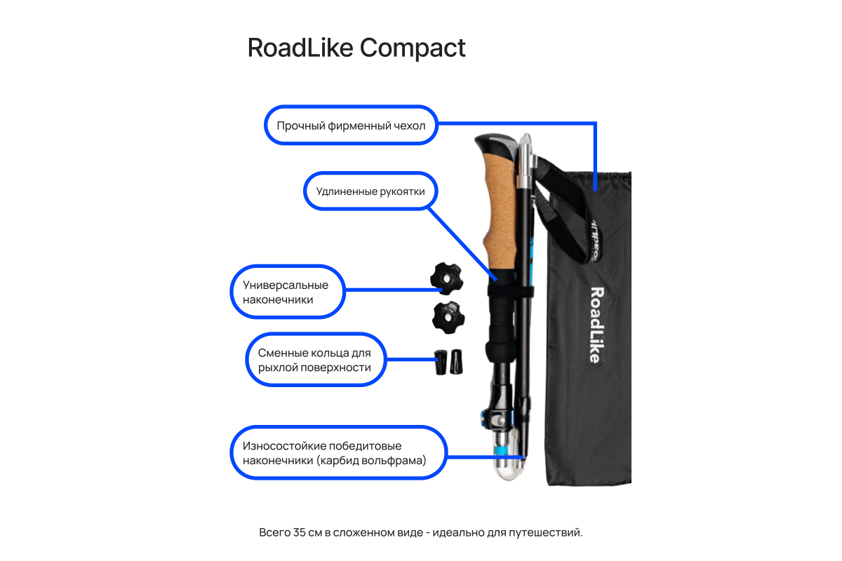 Компактные палки RoadLike - это доступное качество и передовые технологии. Удобство и долговечность конструкции, а также продуманная эргономика и стильный дизайн подарят Вам настоящее удовольствие от прогулок. Сложение до 35 см, комфортная пробковая ручка, удобные темляки, надежная фиксация деталей порадуют даже профессионалов. Прекрасно подходят для Российского климата, выдерживают большие нагрузки, мороз, лед, грязь, песок.