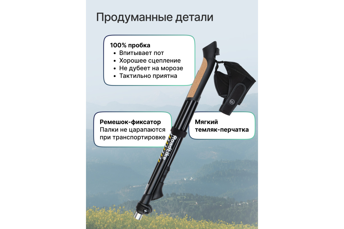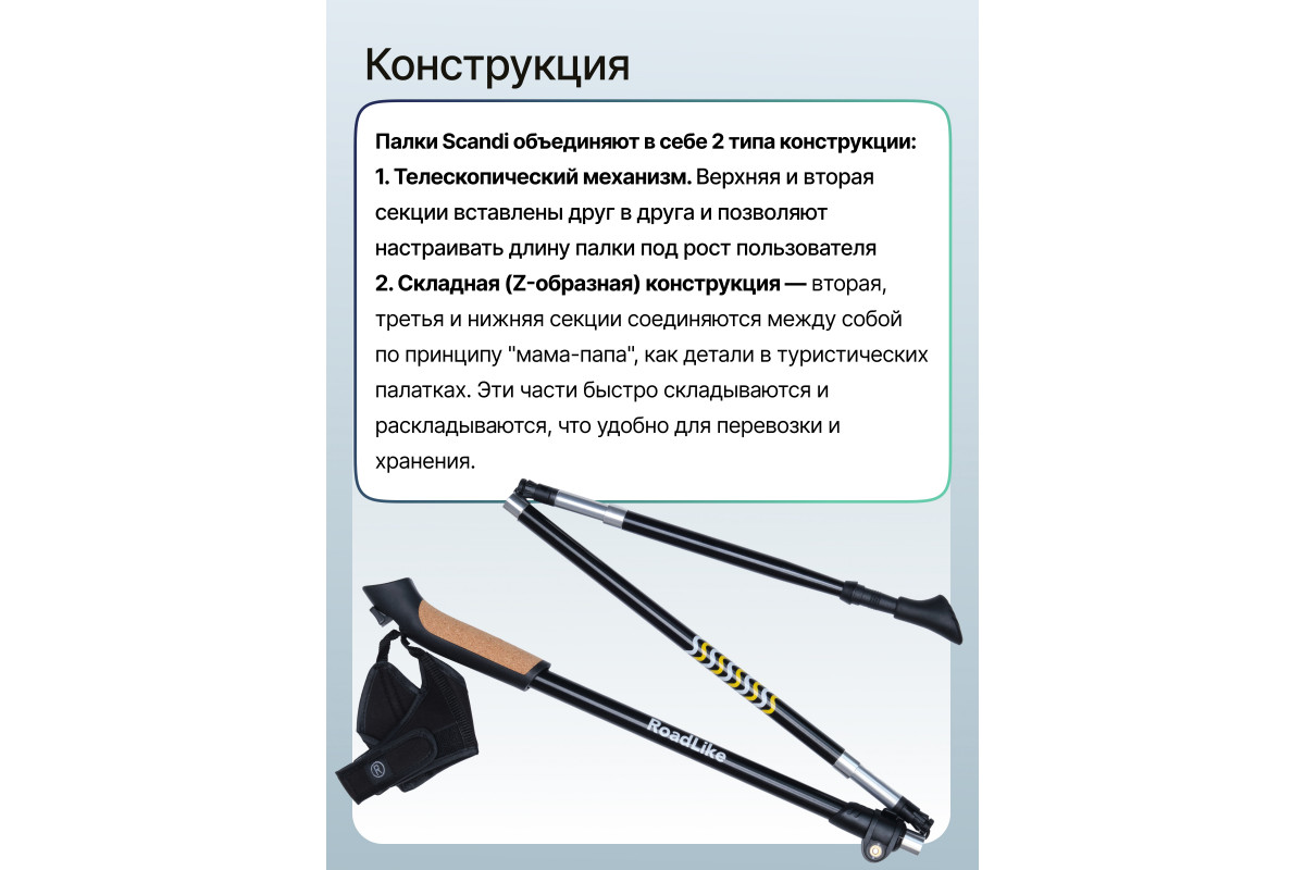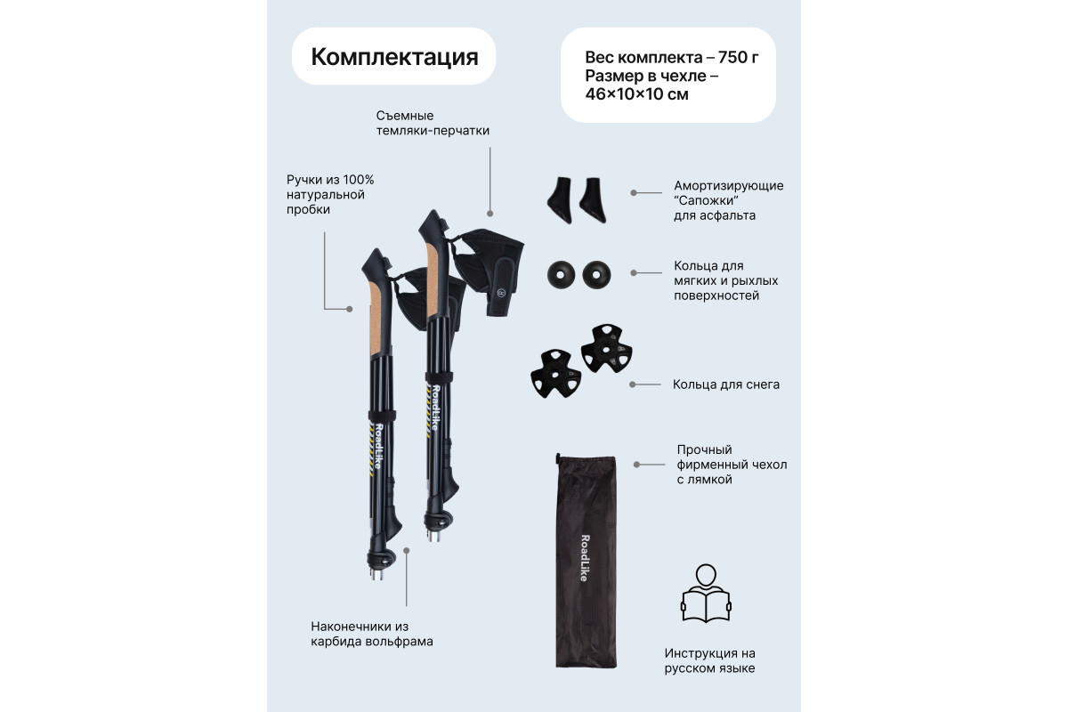 Ультракомпактные палки для скандинавской ходьбы RoadLike Scandi - легкие и удобные складные палки с полным комплектом необходимых аксессуаров, темляк перчатка на липучке и системой регулировки высоты палок до 137 см. Палки RoadLike - это доступное качество и передовые технологии. Удобство и долговечность конструкции, а также продуманная эргономика и стильный дизайн подарят Вам настоящее удовольствие от прогулок. Сложение до 46 см!, комфортная пробковая ручка, удобные темляки-перчатки, надежная фиксация деталей порадуют даже профессионалов. Прекрасно подходят для Российского климата, выдерживают большие нагрузки, мороз, лед, грязь, песок.