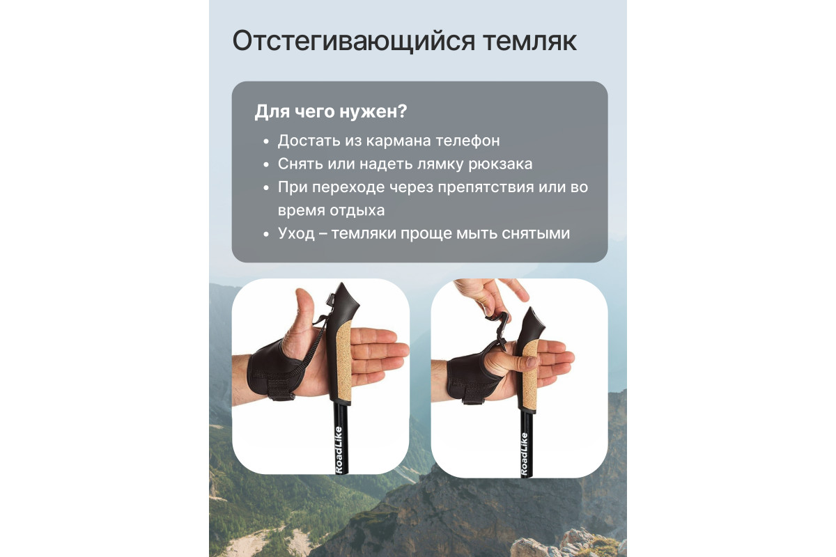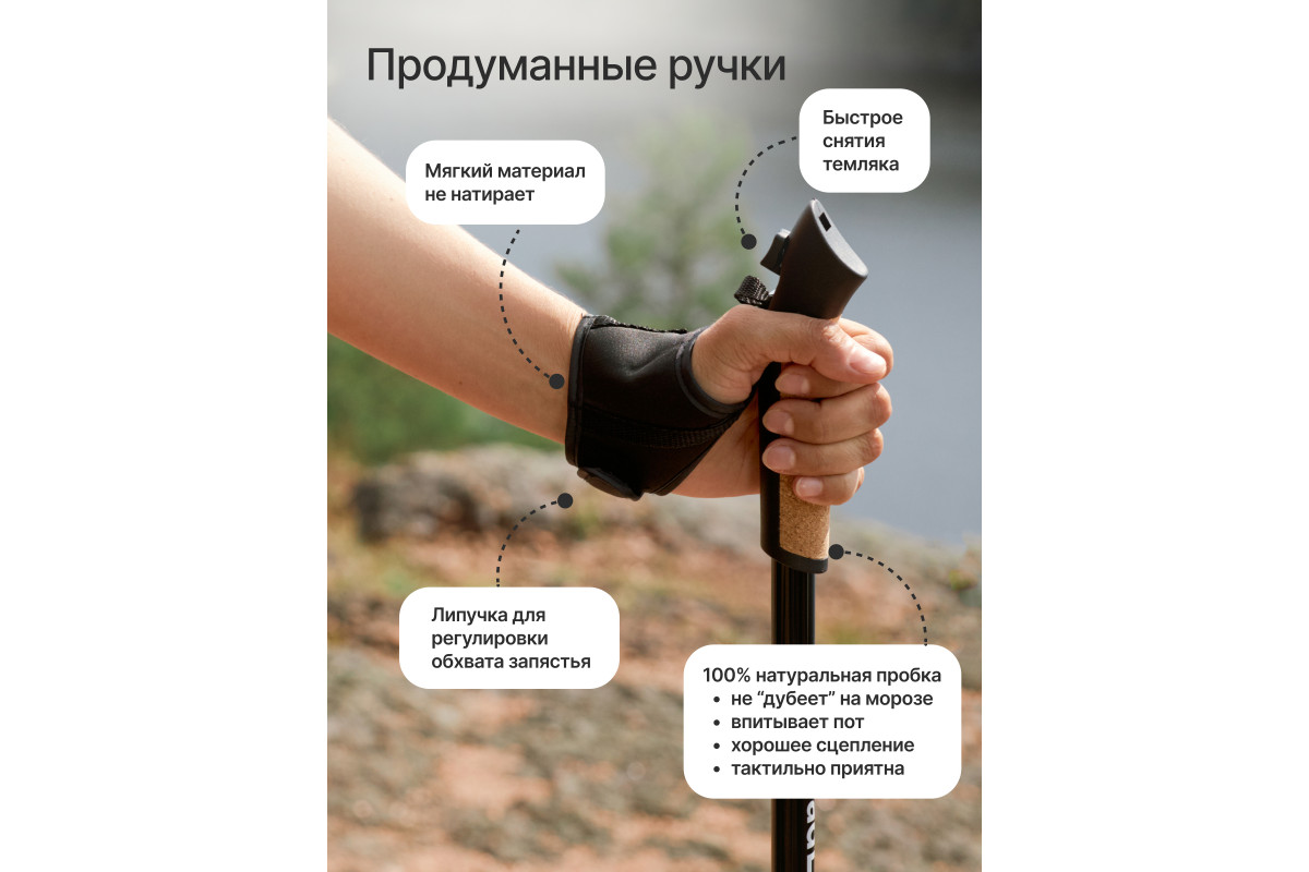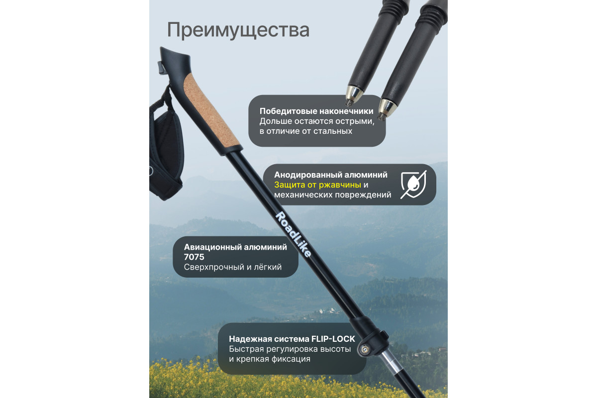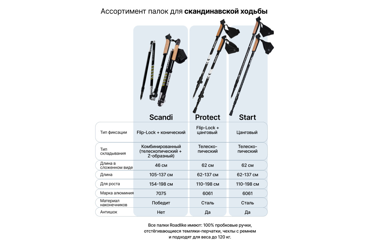 Ультракомпактные палки для скандинавской ходьбы RoadLike Scandi - легкие и удобные складные палки с полным комплектом необходимых аксессуаров, темляк перчатка на липучке и системой регулировки высоты палок до 137 см. Палки RoadLike - это доступное качество и передовые технологии. Удобство и долговечность конструкции, а также продуманная эргономика и стильный дизайн подарят Вам настоящее удовольствие от прогулок. Сложение до 46 см!, комфортная пробковая ручка, удобные темляки-перчатки, надежная фиксация деталей порадуют даже профессионалов. Прекрасно подходят для Российского климата, выдерживают большие нагрузки, мороз, лед, грязь, песок.