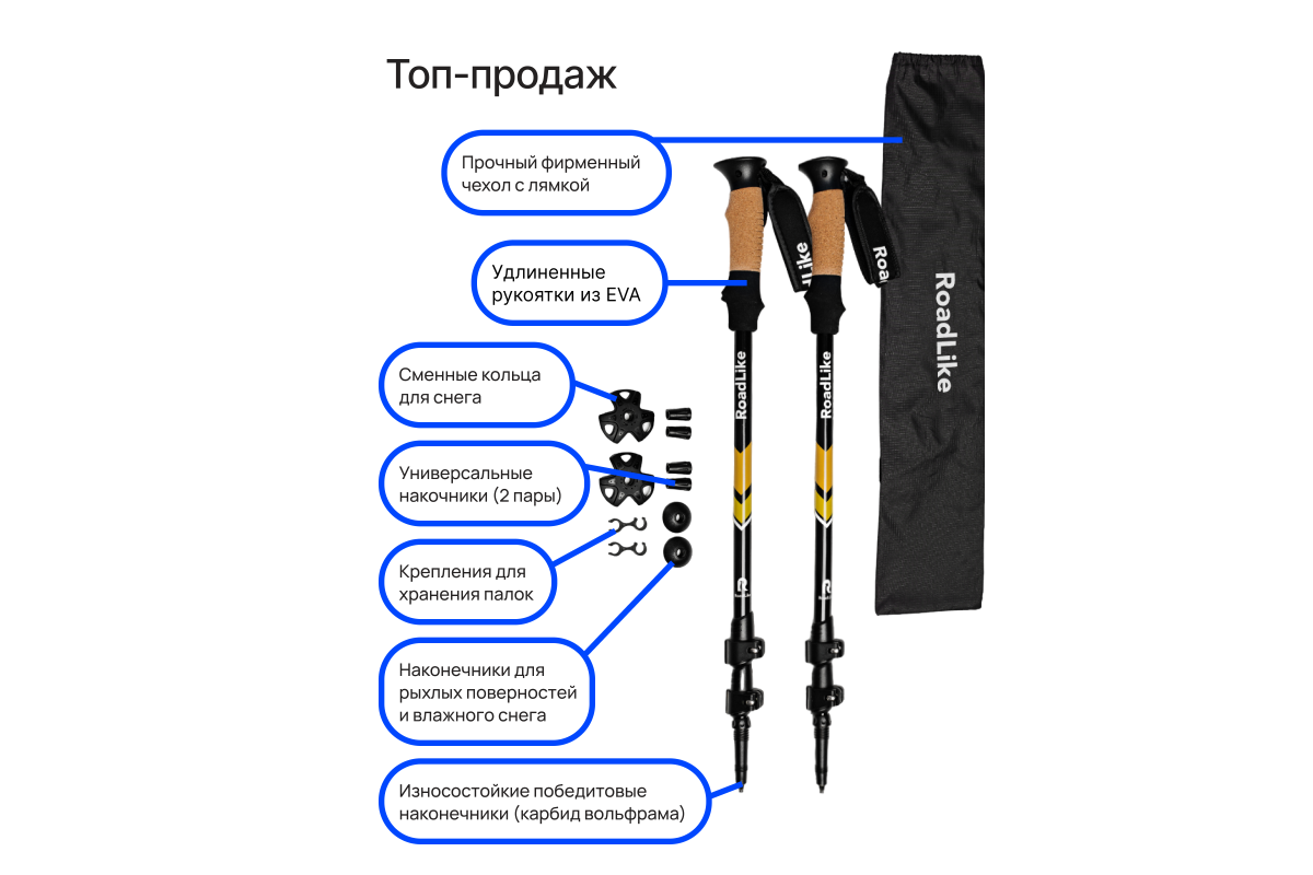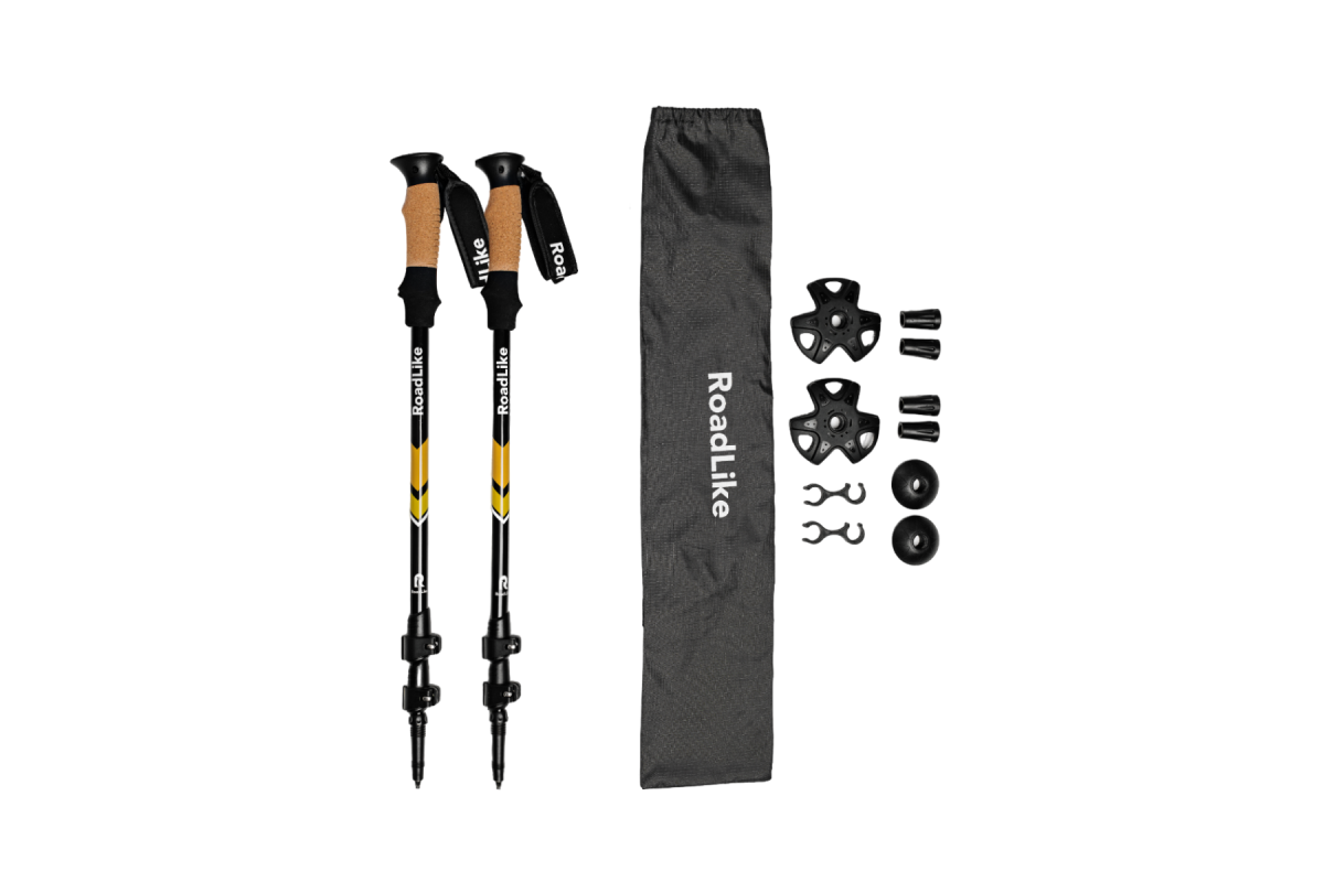 Палки для скандинавской ходьбы RoadLike - легкие и удобные телескопические палки с полным комплектом необходимых аксессуаров и системой flip-lock для регулировки высоты палок от 110 до 137 см.