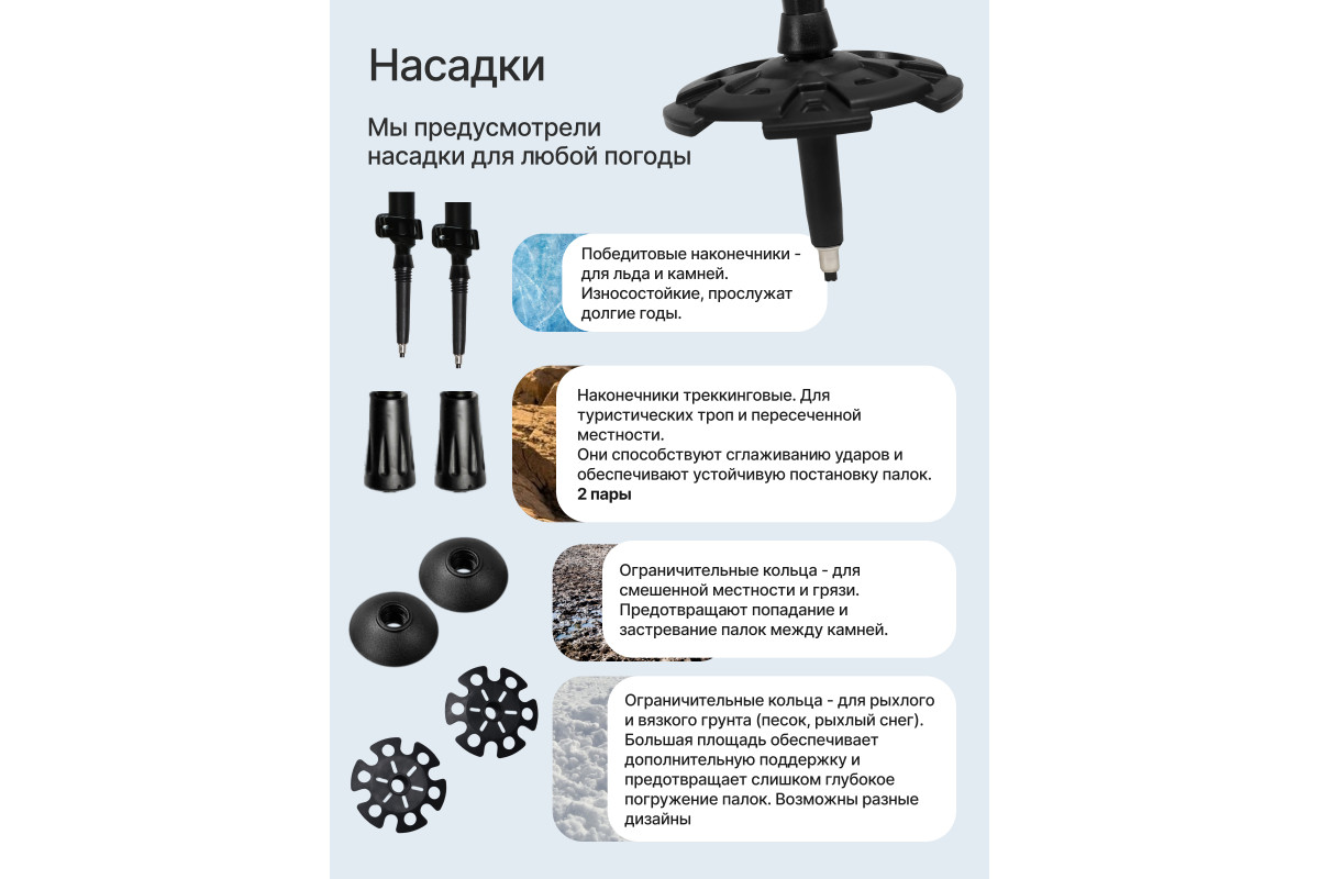 4 резиновых наконечника, темляк 2 шт, чехол, руководство пользователя, палки для ходьбы 2 шт, 2 кольца для грунта, 2 кольца для снега
