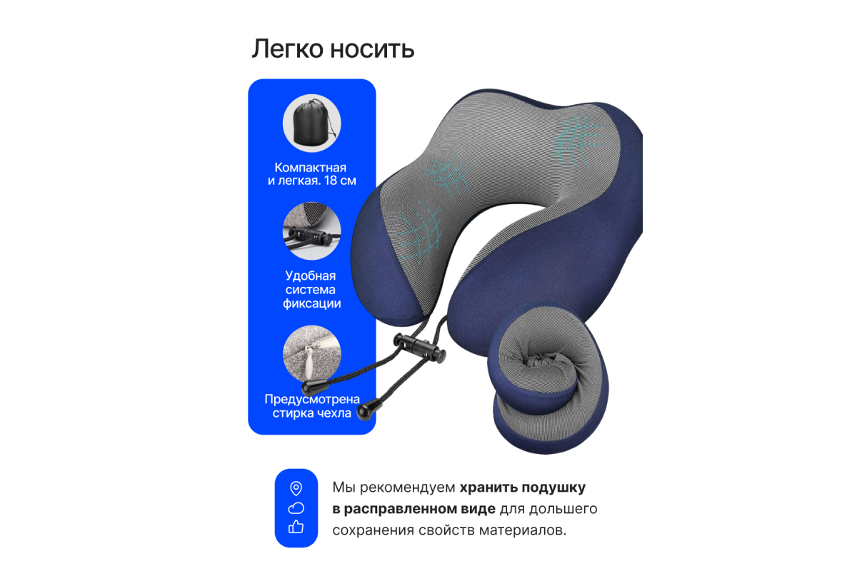 Подушка легко сжимается и собирается в мешочек для хранения.