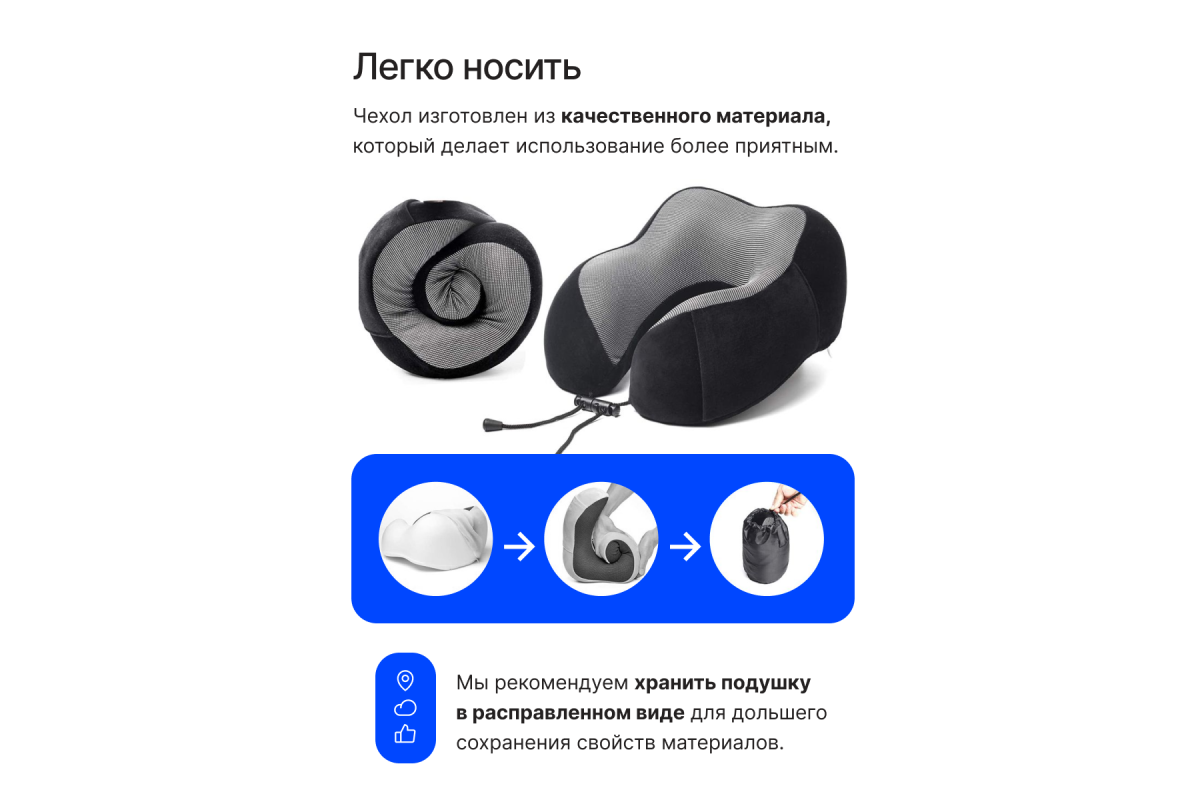 Подушка легко сжимается и собирается в мешочек для хранения.
