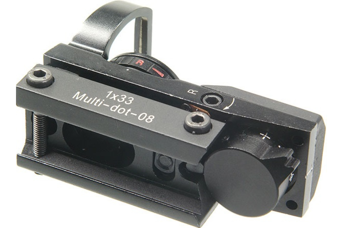 Прицел с широким углом обзора, идеально подходит для скорострельных типов оружия, для стрельбы по движущимся мишеням. Типы сетки (4 типа) — сменные. Подсветка зеленая/красная с регулировкой яркости.Регулировка по горизонтали осуществляется ключом-шестигранником, по вертикали — регулировочным винтом со стандартными делениями и фиксируется запирающим винтом.
