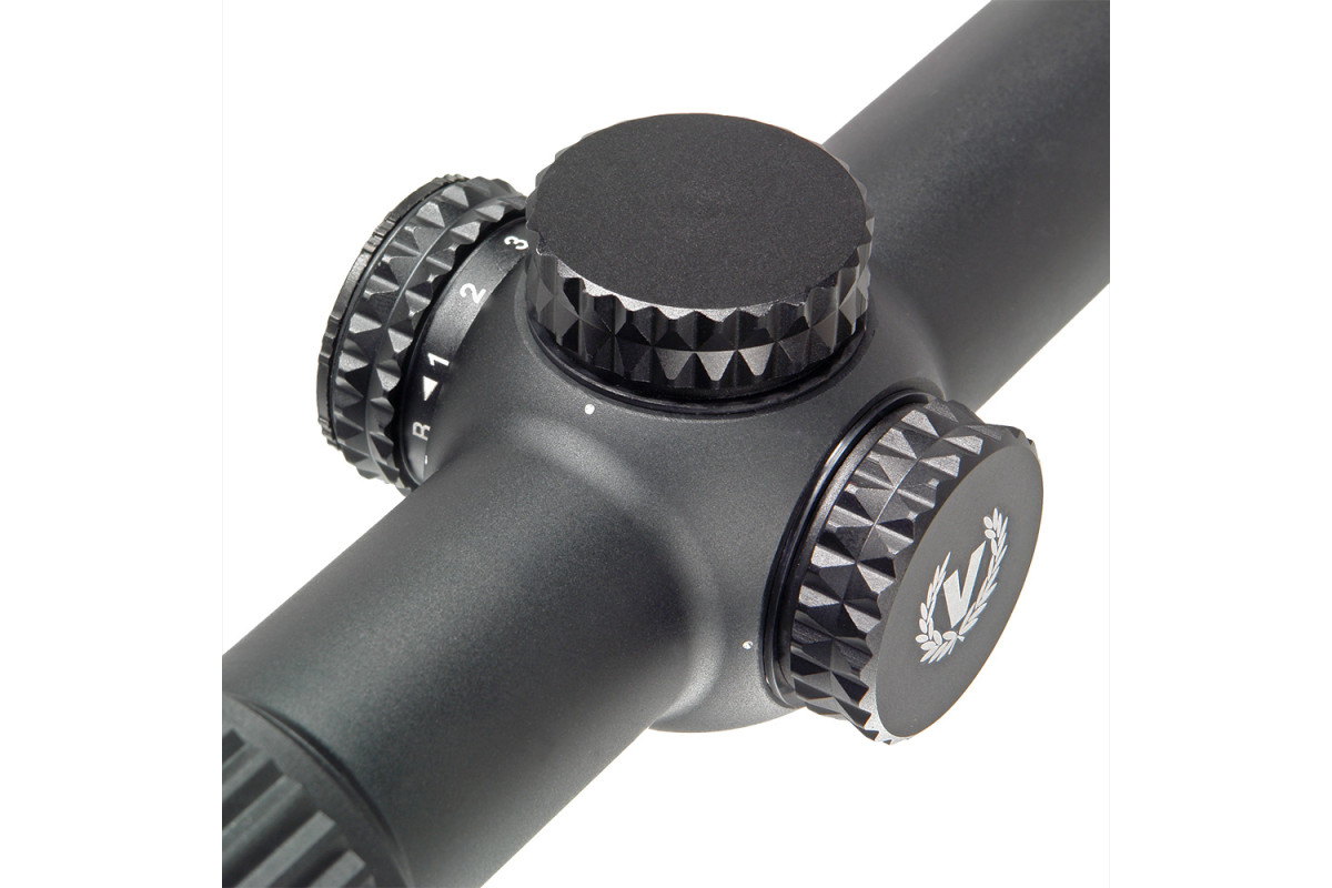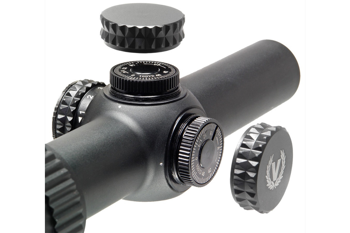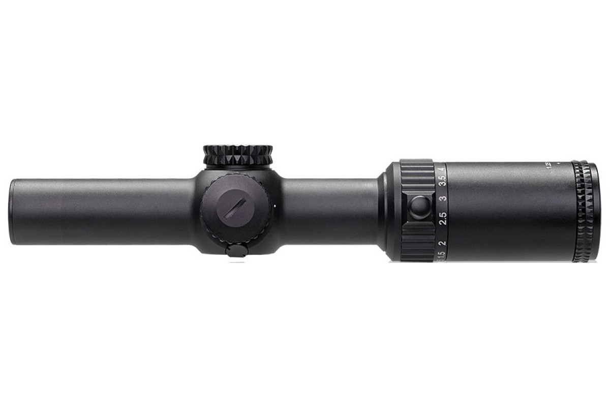 Линза объектива заглублена на 18 мм, блок подсветки расположен на окулярной части прибора. Veber Wolf 1,25-4,5*26 IR Загонник имеет сетку типа Donut Dot с двумя цветами подсветки — подсвечивается только кружок с точкой в центре перекрестья: зеленая (5 позиций переключателя) или голубая (5 позиций переключателя). Точный механизм ввода поправок — открытого типа (герметичный), цена деления 1/4 МОА.