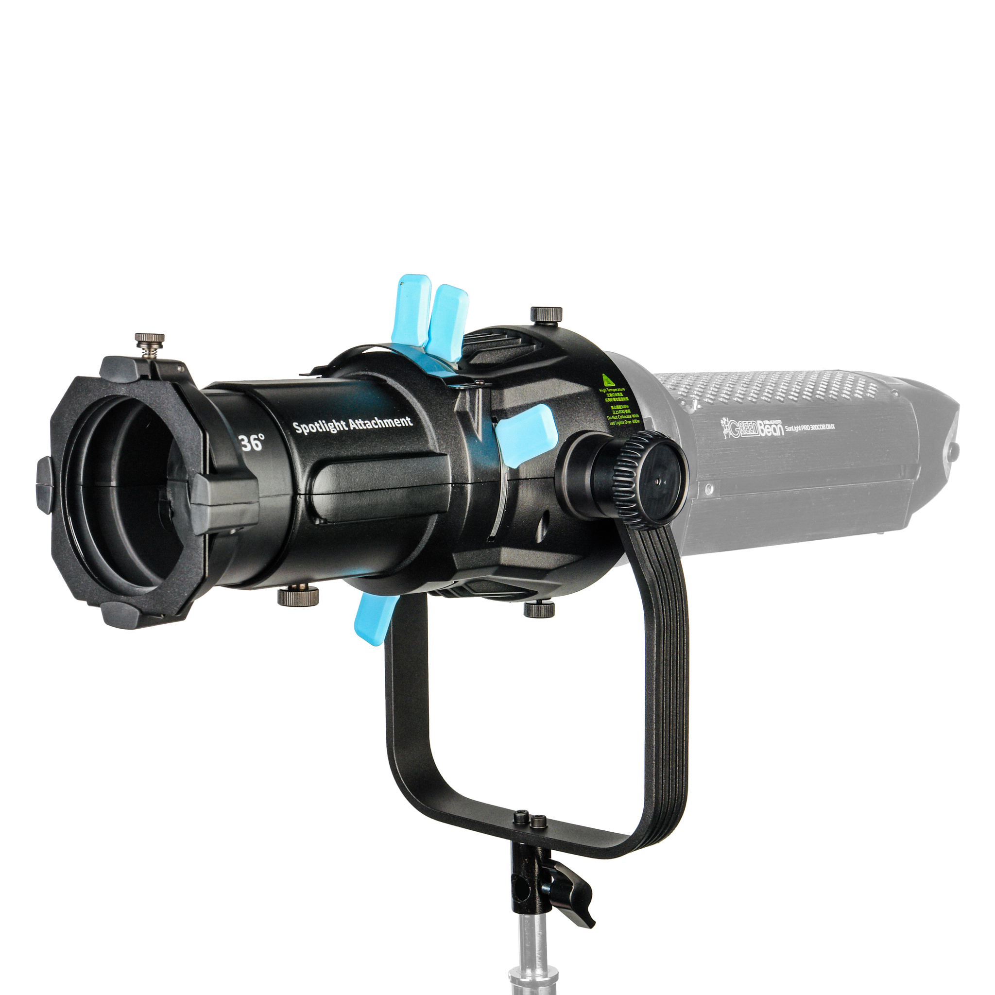 Проекционная насадка VideoSpot 36 Set предназначена для направленного освещения с узким углом рассеивания света, обеспечивающим четкую фокусировку светового потока. Стандартная комплектация предусматривает наличие сменной линзы, имеющей угол рассеивания 36°. Конструкция насадки позволяет создать световое пятно с равномерным уровнем освещенности от центра к периферии, что идеально подходит для выделения объектов съемки, акцентирования внимания на деталях и формирования специфического художественного эффекта.
