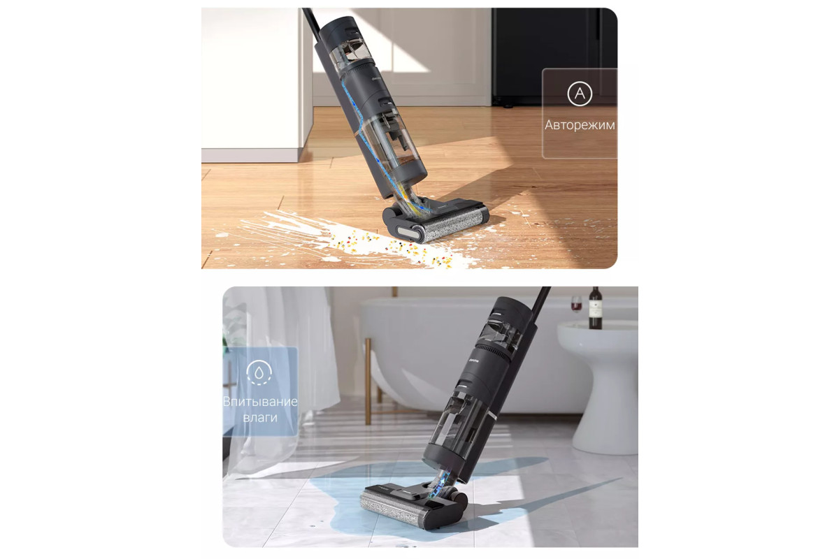 Можно переключаться между двумя режимами, чтобы сделать уборку более эффективной. Первый предполагает автоматическую регулировку мощности всасывания, а второй позволяет быстро впитывать влагу.
