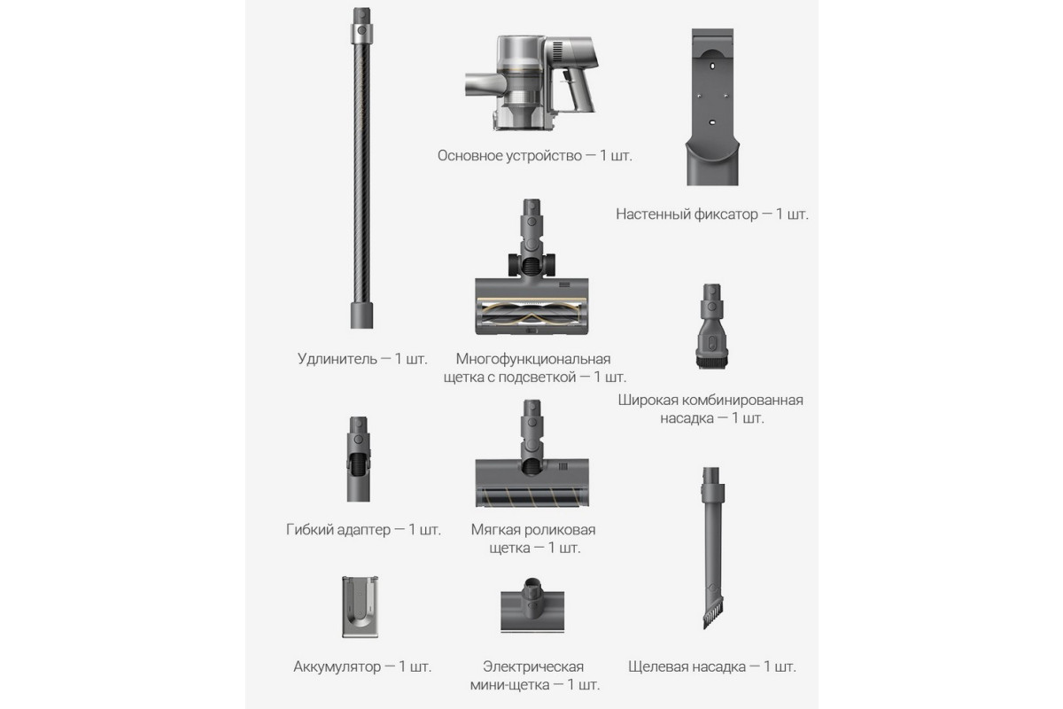 Вместе с Dreame R20 поставляется две щетки: многофункциональная щетка для уборки всех типов напольных покрытий и мягкая роликовая щетка для эффективной уборки гладкого пола.