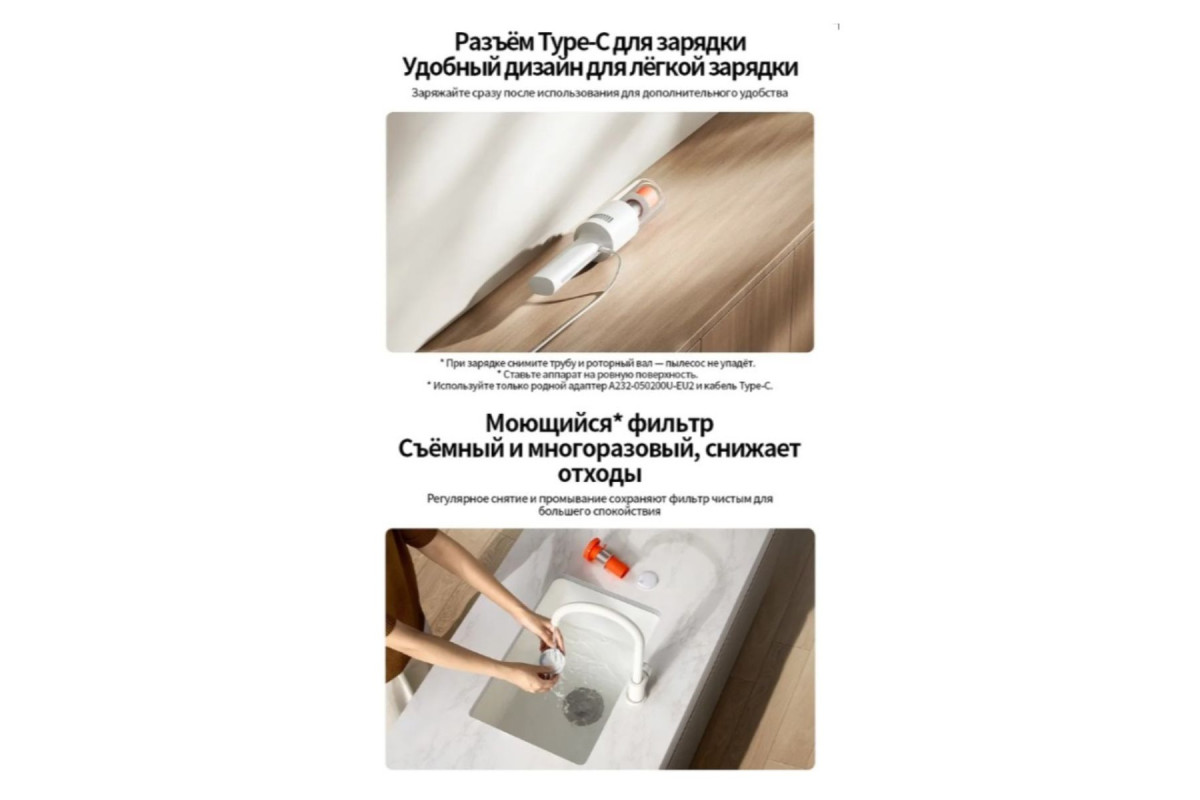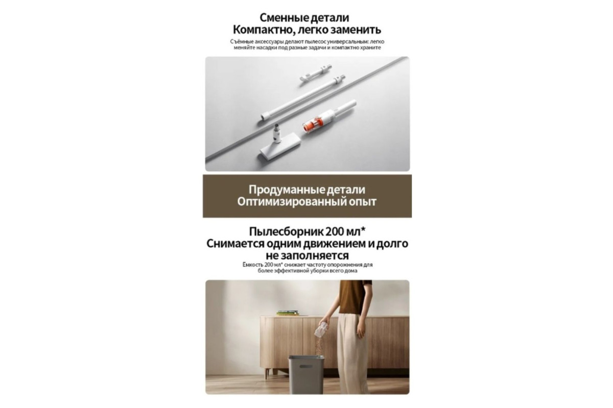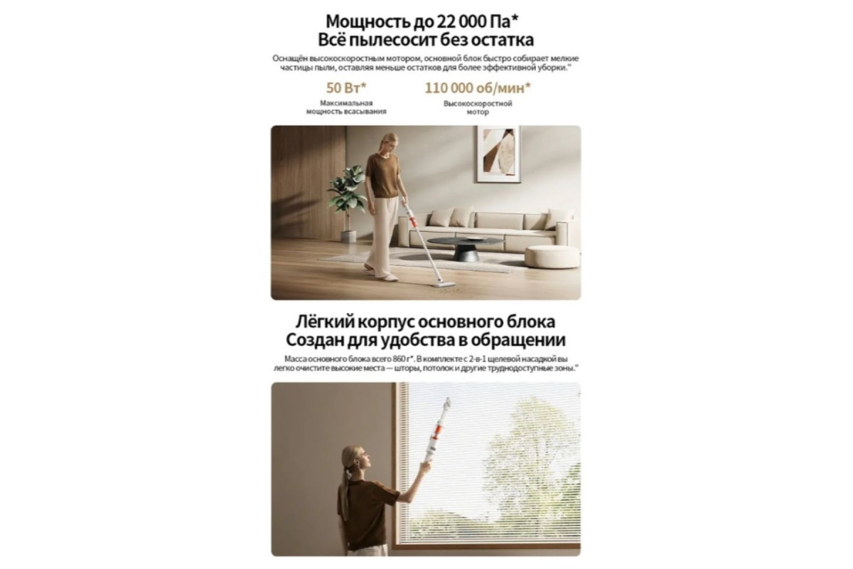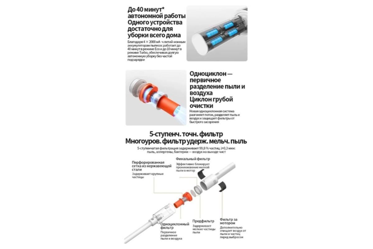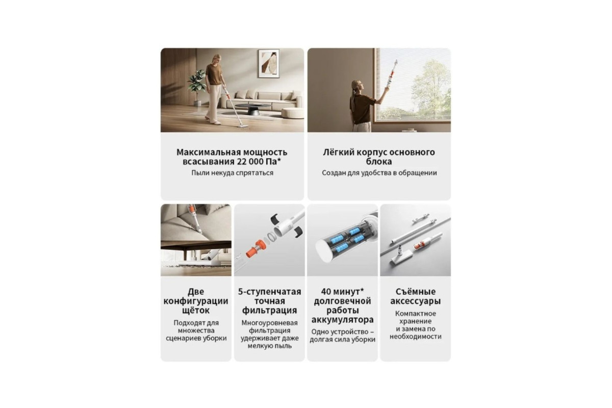 Легкое и удобное, мощное беспроводное всасывание. Максимальное давление всасывания 22 000 Па. Пыли негде спрятаться. Облегченная конструкция основного блока. Разработан для удобного использования. Две конфигурации щеточных головок. Подходит для широкого спектра задач по уборке. 5-ступенчатая точная фильтрация. Многослойная фильтрация задерживает даже мелкую пыль. Длительное время работы от батареи: 40 минут. Одна машина для длительной и эффективной очистки. Съемные аксессуары. Компактный и заменяемый по мере необходимости. Компактный корпус и высокая производительность. Мощное всасывание и длительное время работы от батареи. Максимальное давление всасывания 22 000 Па. Сверхмощное всасывание не оставляет пыли ни единого места для скопления. Оснащенный высокоскоростным двигателем, основной блок быстро собирает мелкие частицы пыли, оставляя меньше остатков для более эффективной уборки. Основной блок весит всего 860 г. В сочетании с щелевой щеткой 2-в-1 вы можете легко очищать высокие места, такие как шторы или потолки. Благодаря 4 литий-ионным аккумуляторам емкостью 2000 мАч и 2 режимам уборки, пылесос обеспечивает до 40 минут непрерывной уборки в экономичном режиме при использовании с насадкой-щеткой или щелевой щеткой 2-в-1; и до 10 минут мощной уборки в турбо-режиме. Длительное время работы и высокая мощность всасывания снижают необходимость частой зарядки. Технология одноконусной циклонной сепарации. Циклонная система для первичного отделения пыли и воздуха.