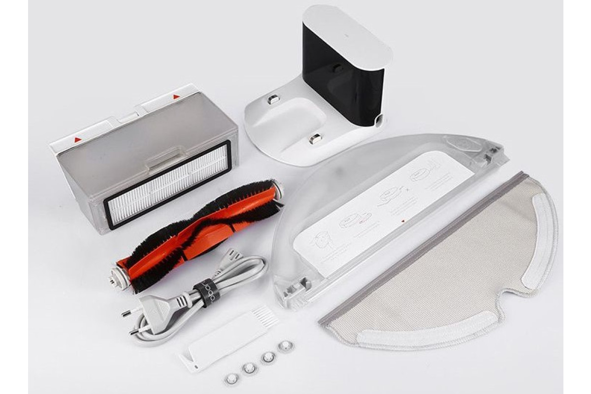 контейнер для воды, боковые щетки, щетка для чистки, сетевой адаптер, робот-пылесос, зарядная база, воздушный фильтр