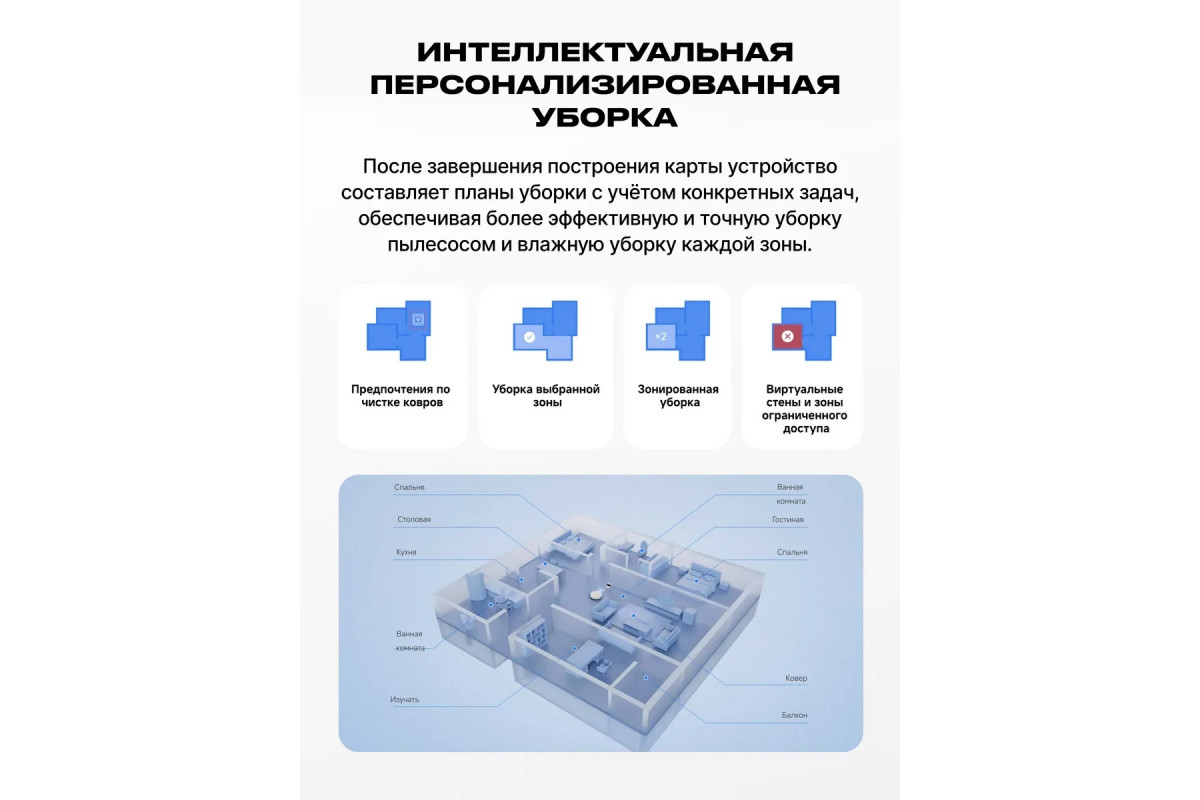 ограничитель зоны уборки, многоуровневое картографирование, Зонирование помещения на комнаты, Построение карты помещения, быстрая уборка, по спирали, по заданному маршруту, вдоль стен, S-образное движение, Построение карты в реальном времени, местная уборка