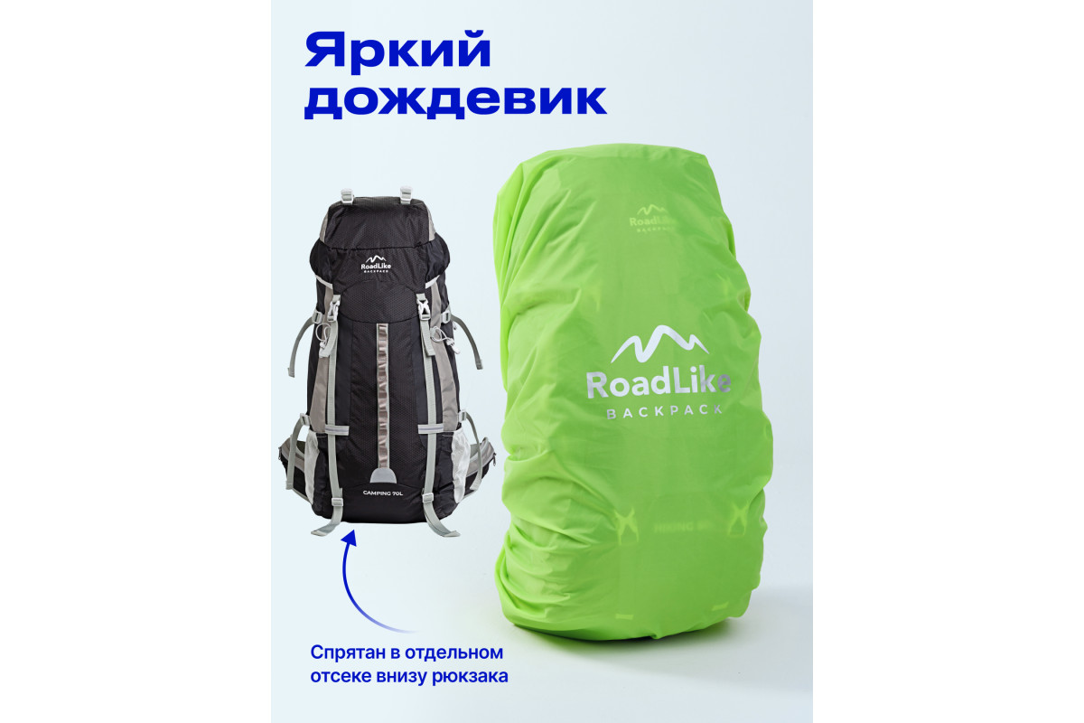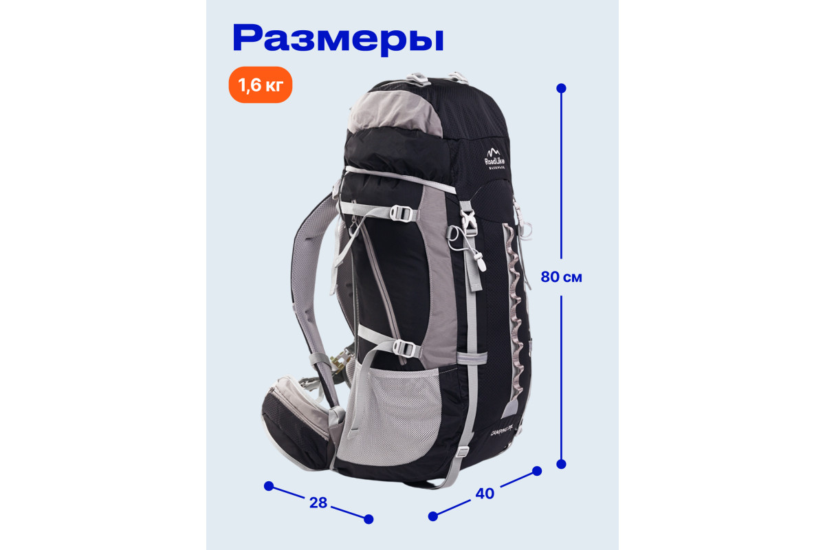 Размер: 66-80см*40*28 см. Размер фронтальных лямок: 58-100 см. Размер боковых ремней: 58-132 см (обхват). Объем 70 л (50+20л). Roadlike - всегда по пути!