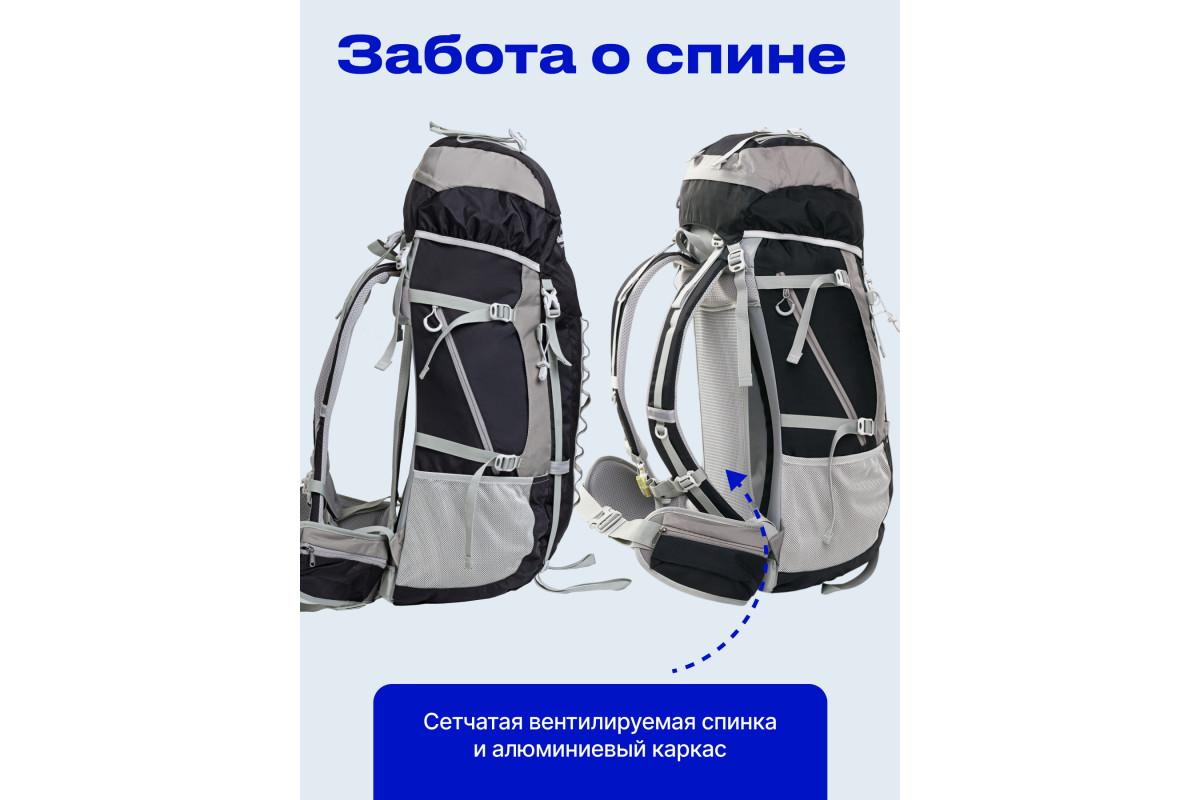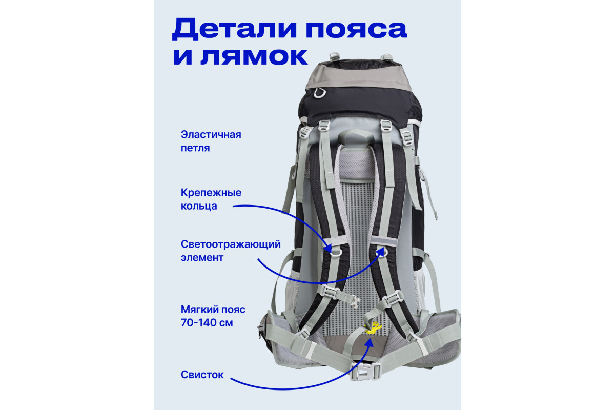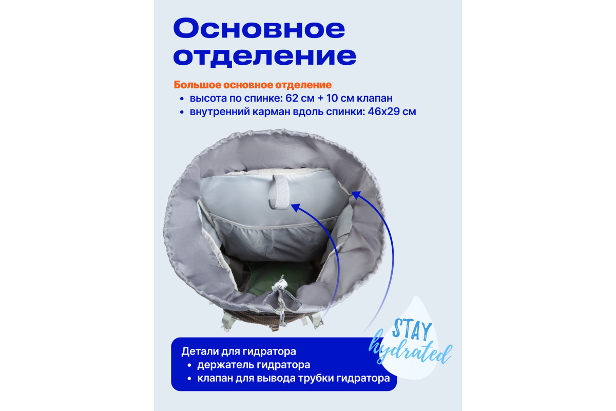 Рюкзак походный вмещает всё снаряжение, необходимое для путешествий. Имеет одно большое внутреннее отделение, которое затягивается шнурком и закрывается клапаном при помощи застежек типа фастекс. На фронтальной поверхности рюкзака предусмотрены точки крепления для трекинговых палок и другого дополнительного снаряжения. Рюкзак эргономичный и легкий, подходит для людей, которые много путешествуют, в том числе на дальние расстояния, ценят комфорт и удобство.