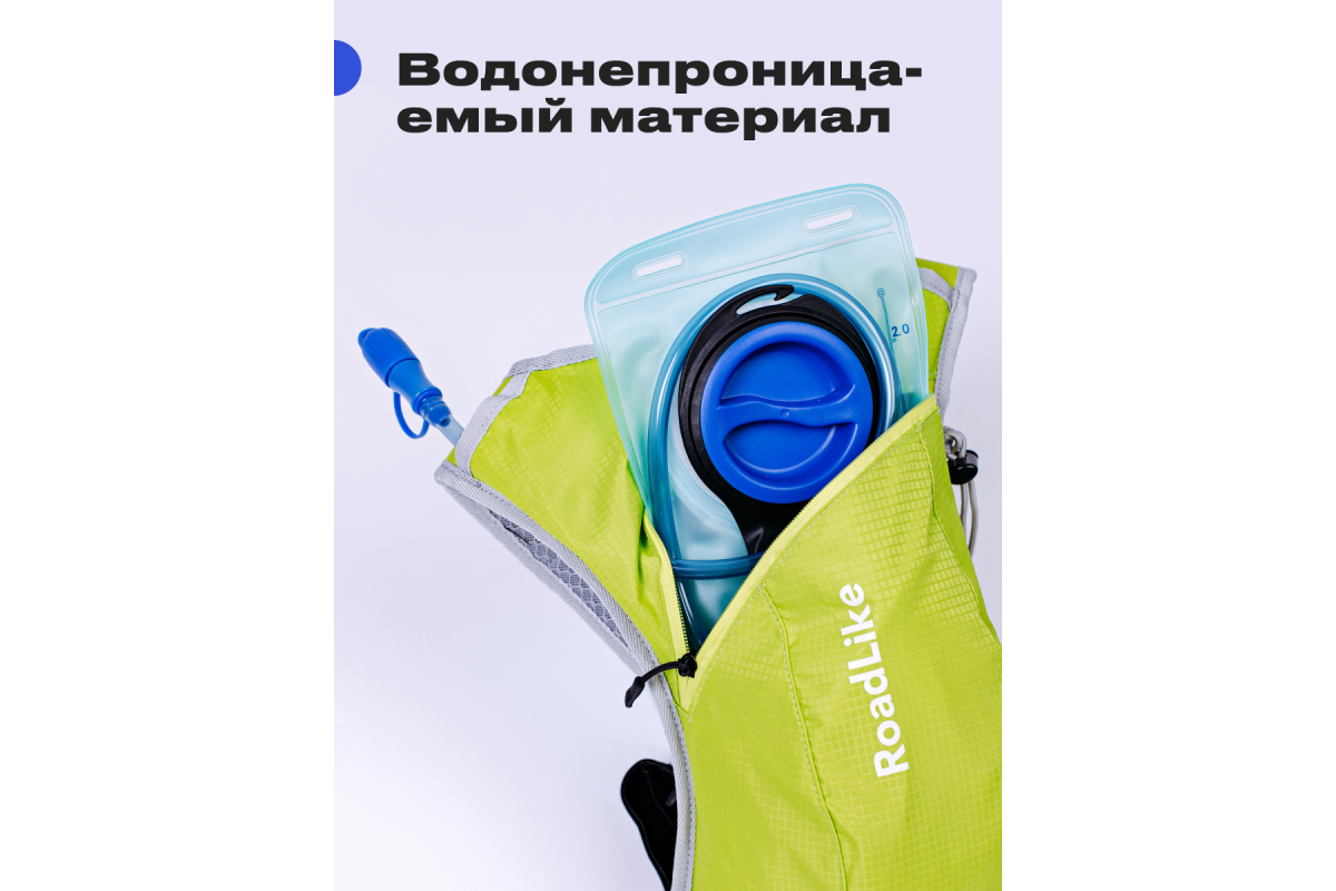 Рюкзак с гидросистемой RoadLike Hydro Camping. Спортивный рюкзак оснащен питьевой системой 2л. с специальным мундштуком для питья воды. Рюкзак оснащен двумя мягкими анатомическими лямками, которые можно регулировать по длине и вентиляцией в районе спины, а также светоотражающими полосками. Рюкзак-гидратор для бега, велоспорта с питьевой системой позволяет пить, когда заняты руки. Рюкзак беговой с гидратором произведен из прочного полиэстера, который не боится влаги и легко очищается от загрязнений.