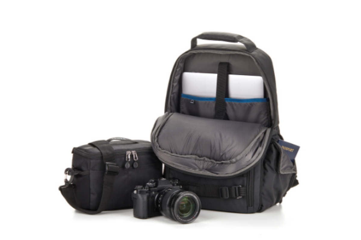 В нижней части рюкзака располагается защитная вставка с фотокамерой и объективами, остальное пространство предусмотрено для личных вещей. Удалив защитную вставку, вы можете использовать весь объем рюкзака для личных вещей.