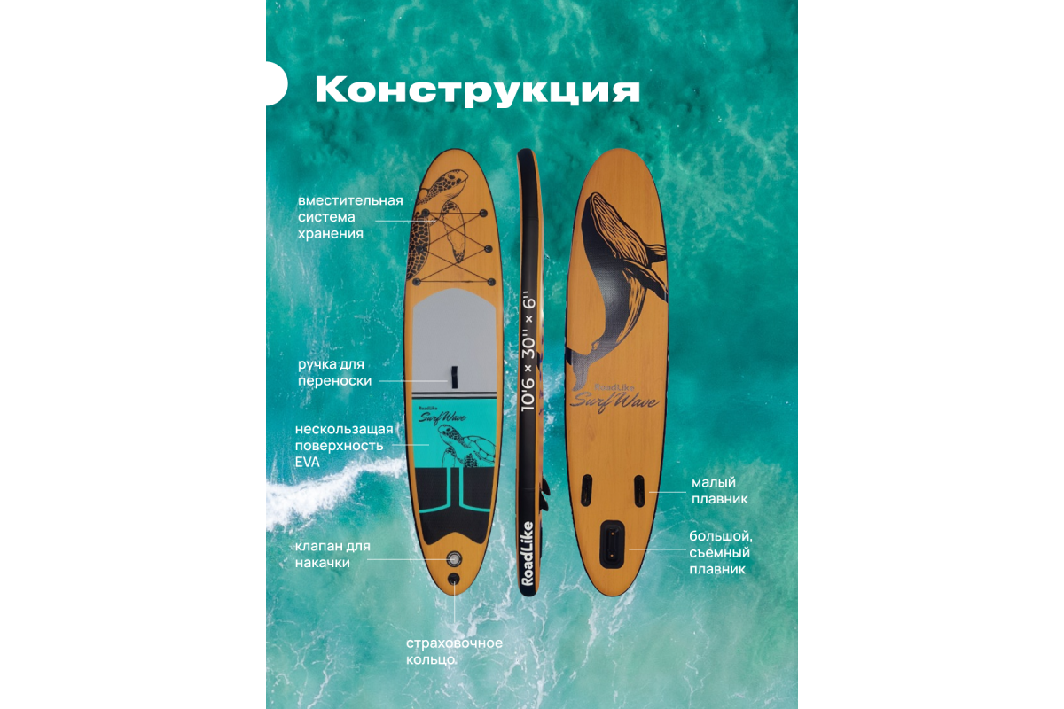 Сапборд RoadLike Wave - новинка сезона 2022, отличается увеличенным размером и как следствие максимальной нагрузкой и устойчивостью. Произведена из 2-х слойного ПВХ, с использованием современной технологии Drop Stitch Light. Несмотря на свой легкий вес, доска имеет очень хорошую жесткость и прочность. Доска имеет шероховатую, антискользящую поверхность EVA с ромбовидным протектором для максимальной надежности и фиксации. Удобная и эластичная шнуровка позволит разместить весь необходимый багаж на доске. В комплекте с доской идут: насос высокого давления с манометром, 3-х секционное весло, ремкомплект, лиш, плавники и фирменный рюкзак для хранения и переноски. Свойства сапборда RoadLike Wave: Габариты 320 х 81 х 15 см, Объём 320 л, Вес 8,6 кг, Грузоподъемность 180 кг, Оптимальное давление 15 PSI. RoadLike - нам по пути!