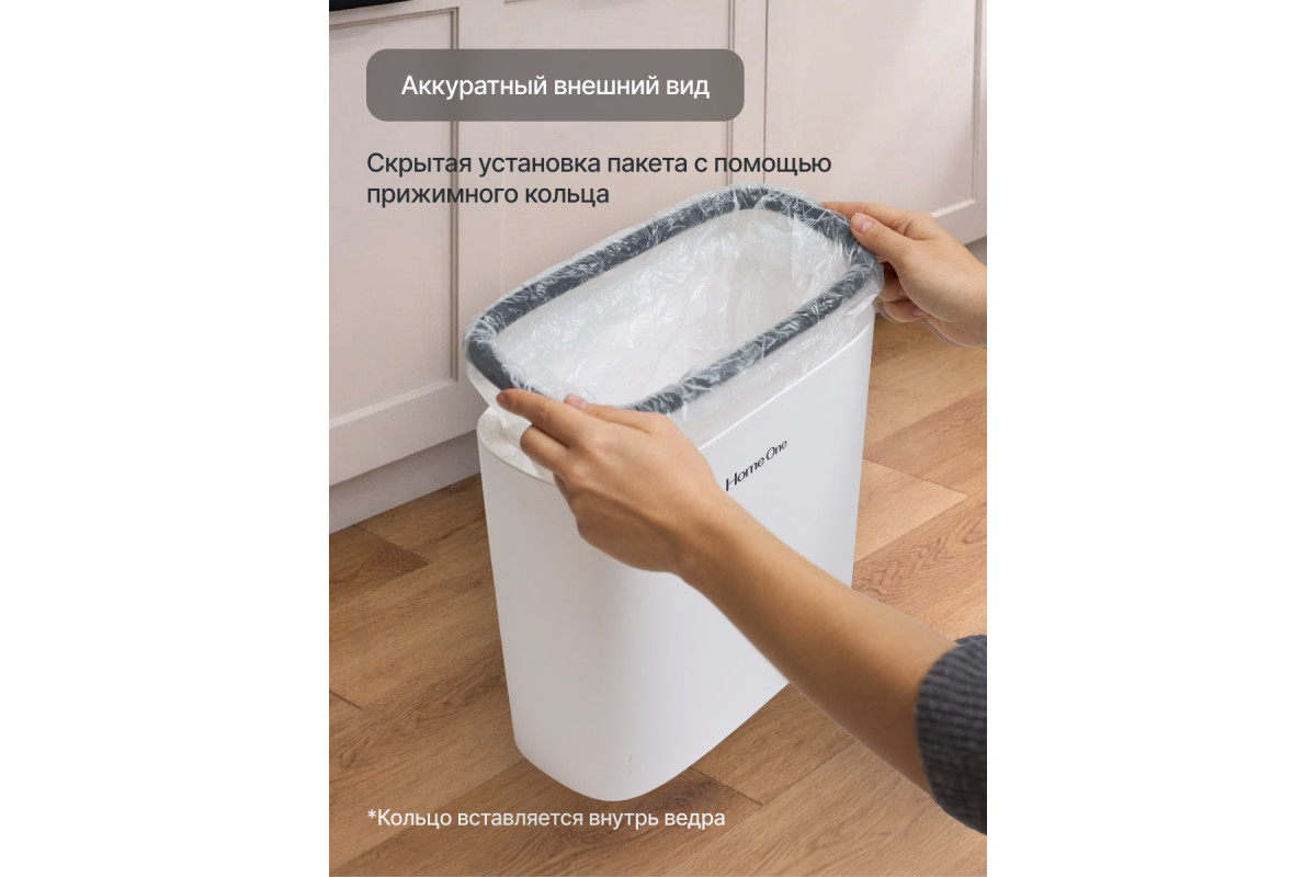 В ведре предусмотрена удобная система установки пакета для мусора с помощью прижимного кольца.