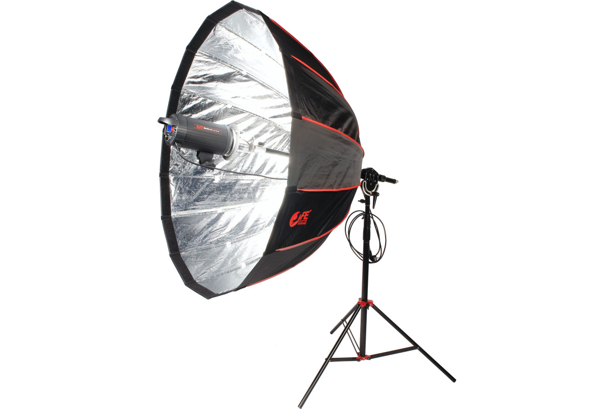 Для достижения наилучшего результата освещения рекомендуем использовать большие глубокие параболические софтбоксы, такие как шестнадцатиугольные Falcon Eyes Extend FEA-OB9 BW или Falcon Eyes Extend FEA-OB12 BW. Софтбокс устанавливается в байонетное кольцо Bowens на конце штанги и проворачивается, фиксируясь прижимным винтом. Установить источник света с другим байонетом можно приобретая дополнительно соответствующие переходные кольца.