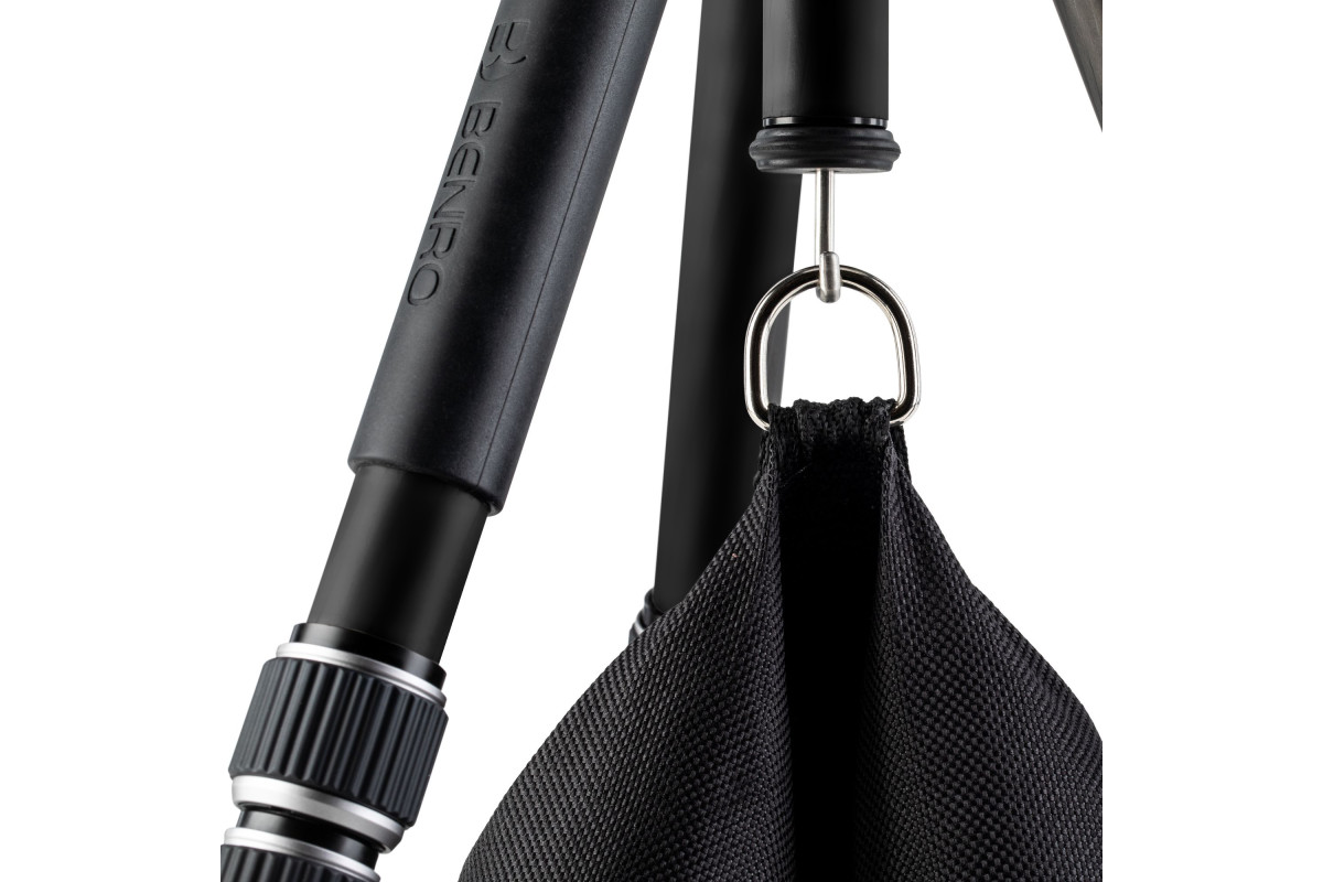 В центральной колонне расположен утопленный подпружиненный крючок, который позволяет подвешивать груз для повышения устойчивости штатива, когда в этом есть необходимость.