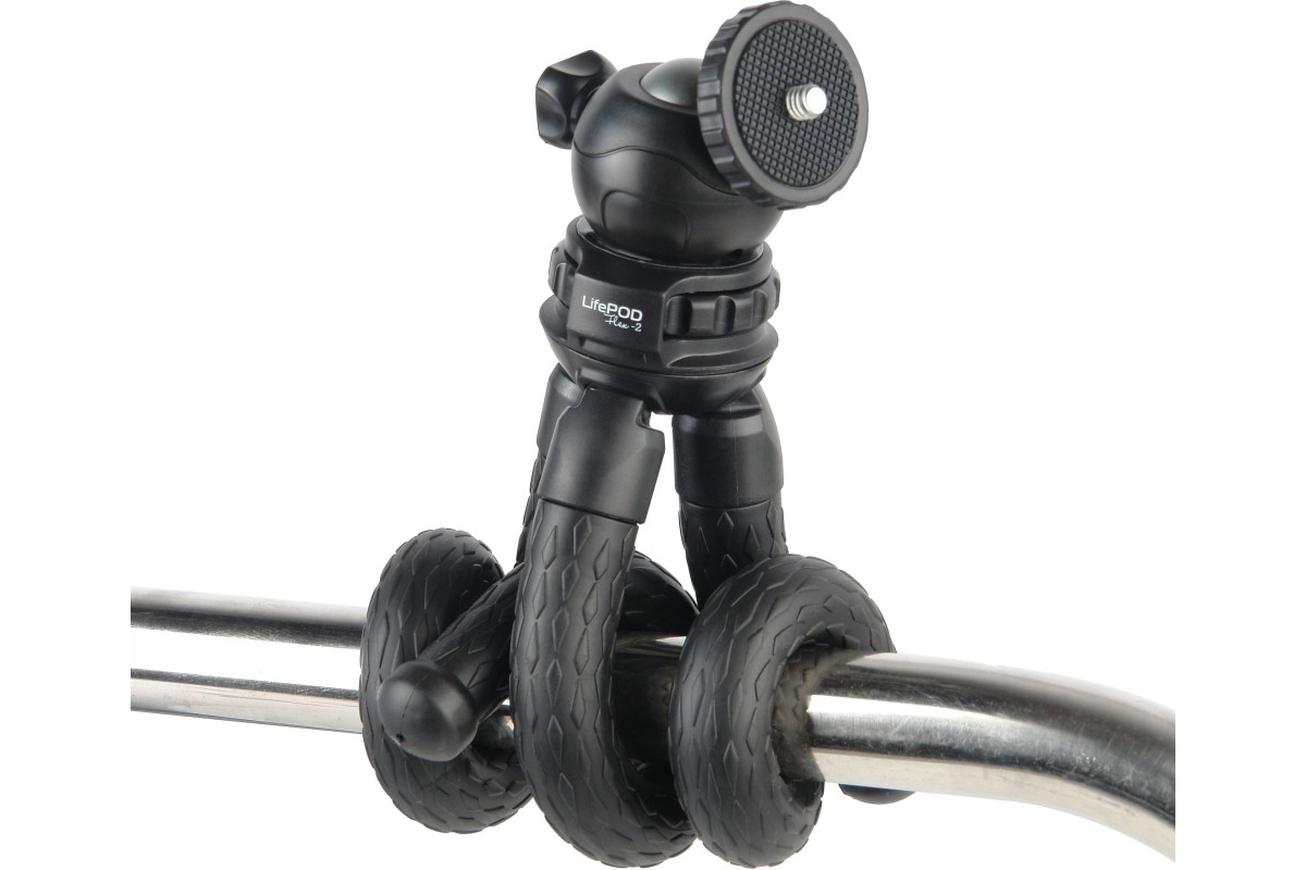 Штатив Falcon Eyes LifePOD Flex-2 с тремя гибкими ножками поможет быстро установить легкую фотокамеру (весом до 1.2 кг), смартфон или камеру GoPro даже на самой сложной поверхности в экстремальных условиях: на выступе, перилах, полке, трубе, ветке дерева и др. Штатив можно использовать как универсальный держатель или подставку для гаджетов (например, электронных книг и планшетов).