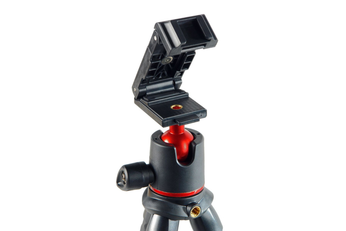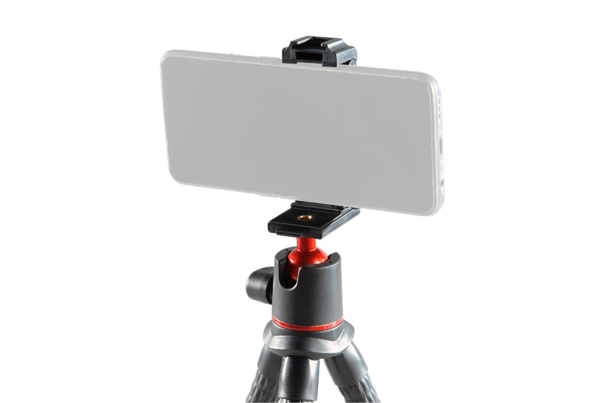 Данная модель штатива включает универсальный набор креплений: головку со встроенным адаптером для смартфона, винт 1/4" для установки цифровой камеры и адаптер для крепления экшн-камеры GoPro