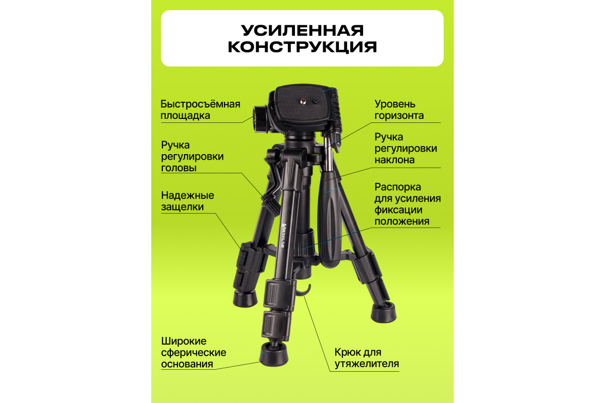 Штатив оснащен встроенной 3D головой с быстросъемной площадкой. Ноги состоят из 3-х секций с зажимами-клипсами. Подпятники штатива имеют шаровое основание, что позволяет надежнее зафиксировать его на поверхности. Для повышения жесткости между ногами штатива установлена распорка, а для дополнительной устойчивости предназначен крюк на который можно подвесить дополнительный груз. Центральная колонна оснащена механической регулировкой высоты.