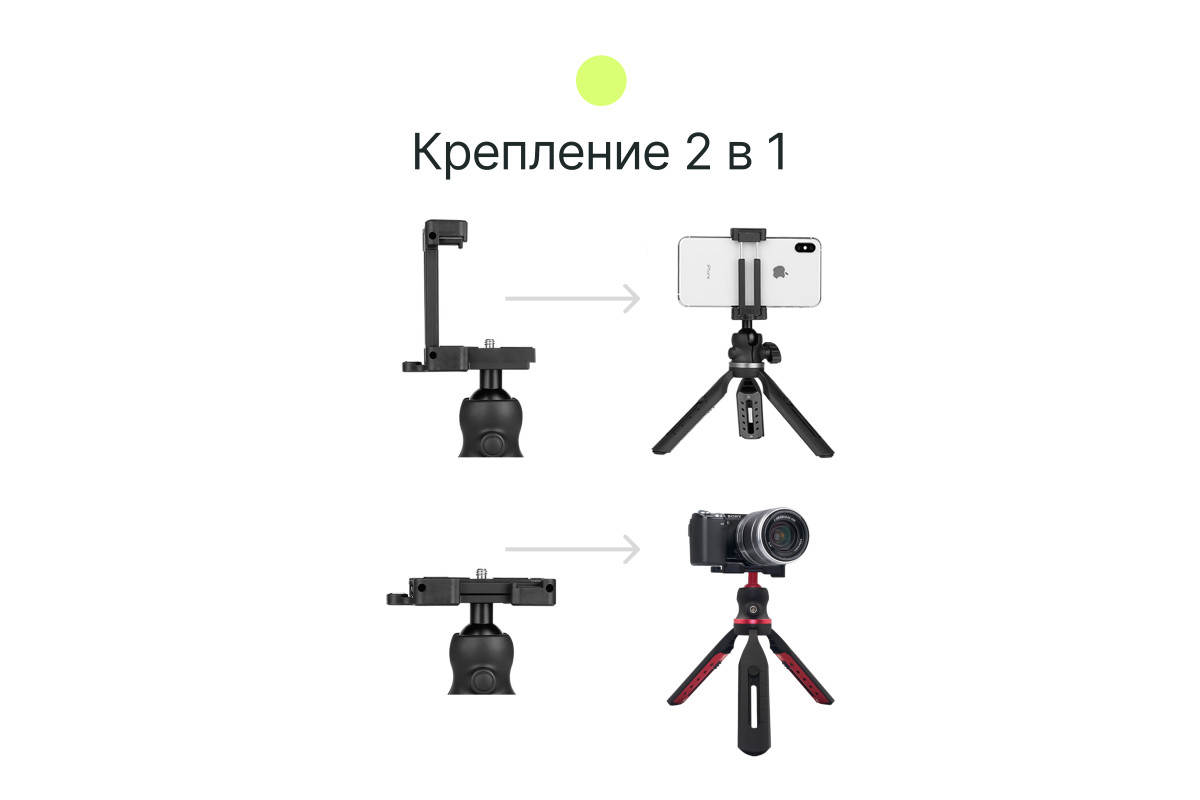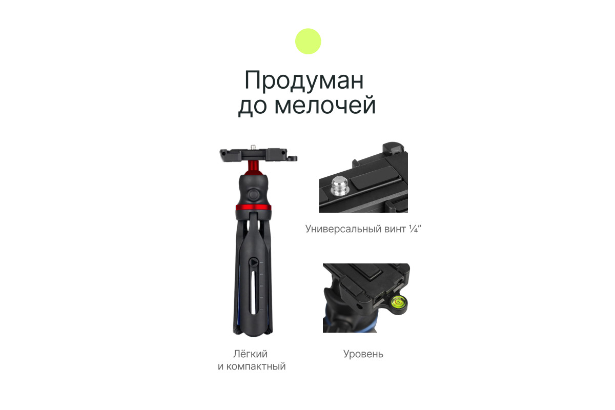 Штатив Raylab MT-SCR –лёгкий, компактный и надёжный мини-штатив для использования с камерами, смартфонами, осветителями, микрофонами, стедикамами, а также другим оборудованием в студии, дома или на выездной съемке. Конструктив модели предусматривает 5 положений ног штатива, шаровую голову с винтовой фиксацией положения, универсальное крепление 1/4", встроенный держатель для смартфона, а также пузырьковый уровень для выравнивая положения относительно земли. Высота штатива регулируется в пределах от 16 до 20 см. В сложенном состоянии ноги штатива можно использовать в качестве рукоятки для фото и видеосъемки, при необходимости съемки в движении или селфи. Штатив выполнен из ABS пластика и алюминия. Мини-штатив MT-SCR будет особенно полезен для блогов, стримов, селфи, предметной и пейзажной съёмок.