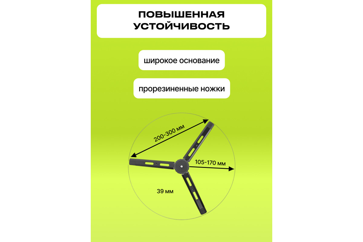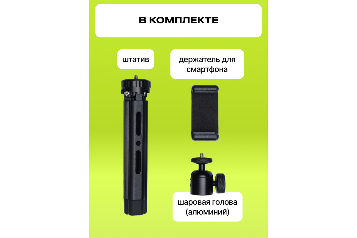 Штатив оснащен шаровой головой, которая обеспечивает стабильность и гибкость при съемке, а также, держателем для телефона, позволяя надежно закрепить телефон и создавать уникальные кадры.