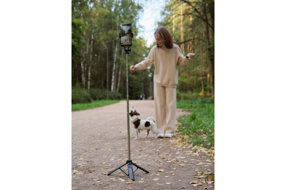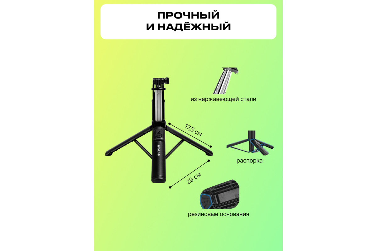 Raylab MT-132 – это селфи монопод увеличенного размера, который совмещает в себе настольный штатив, компактную стойку для легкого оборудования и селфи-палку. Телескопическая центральная штанга выдвигается до 132 см в высоту и имеет на конце держатель для смартфона и крепление 1/4''. Для большей устойчивости в конструкции предусмотрено широкое основание, в котором располагается Bluetooth пульт. Его с легкостью можно вынуть и использовать для удаленного управления камерой смартфона, для фотографирования или запуска / остановки видеозаписи. Благодаря встроенном креплению 1/4 дюйма, устройство можно использовать не только со смартфонами, но и с микрофонами, экшн-камерами и даже небольшими осветителями, оснащёнными универсальным креплением.