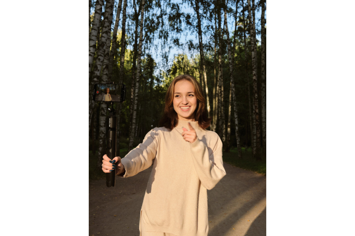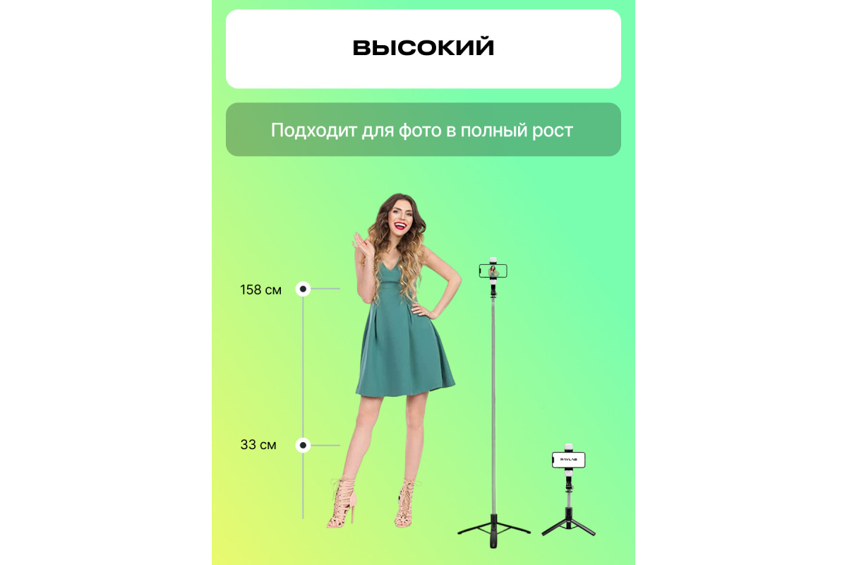 Raylab MT-TH – высокий селфи штатив, который совмещает в себе настольный штатив, компактную стойку для легкого оборудования и селфи-палку. Телескопическая центральная штанга выдвигается от 33 до 158 см в высоту и имеет на конце держатель для смартфона и крепление 1/4''. Для большей устойчивости в конструкции предусмотрено широкое основание, в котором располагается Bluetooth пульт. Его с легкостью можно вынуть и использовать для удаленного управления камерой смартфона, для фотографирования или запуска / остановки видеозаписи.