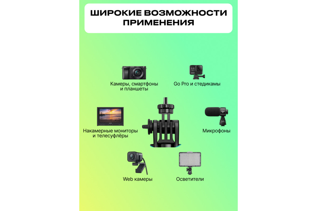 Он отлично подойдет для смартфонов, кольцевых ламп, небольших осветителей, микрофонов и go-pro камер.